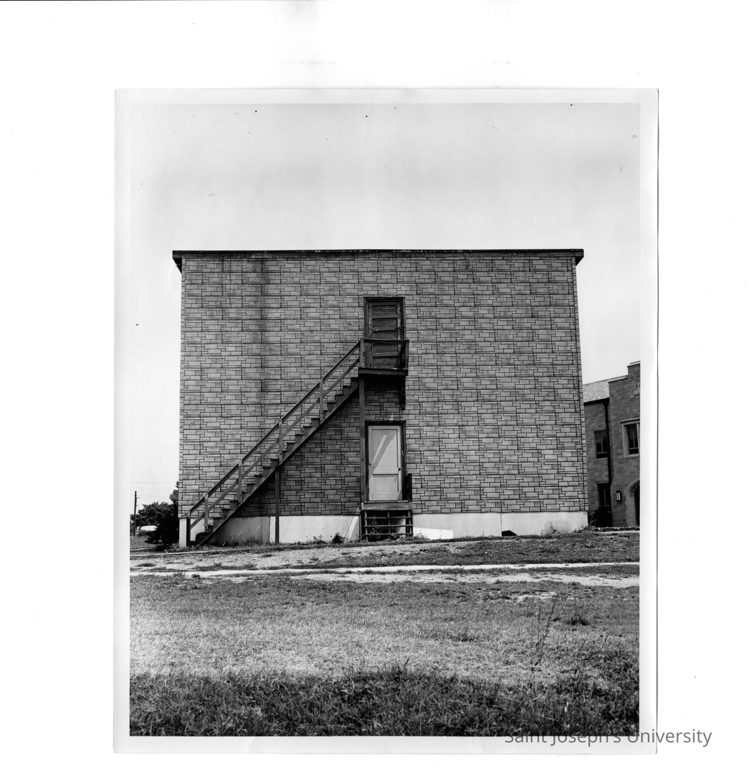 Exterior side view of veterans barracks with steps up to second floor. Barracks located near Cardboard College, also known Barbelin Annex.