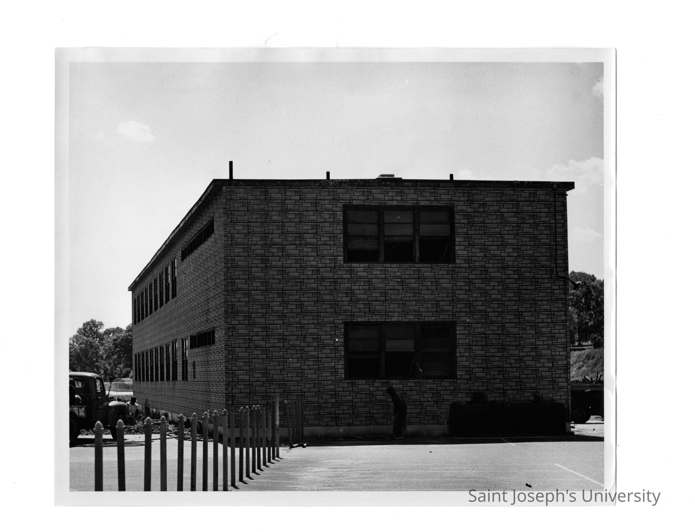 Exterior view of veterans barracks with workmen and pickup truck. Barracks located near Cardboard College also known as Barbelin Annex.