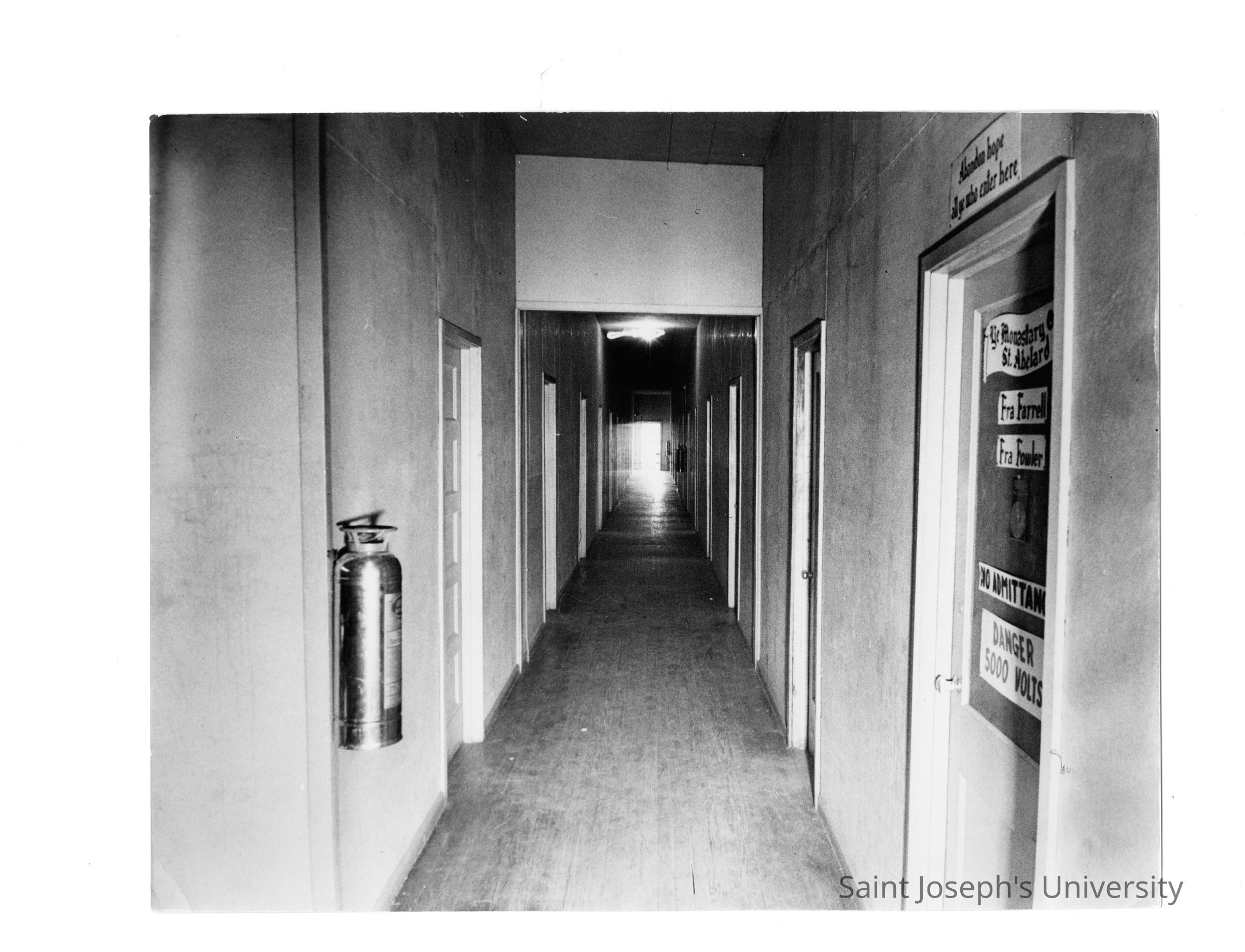 View of hallway in veterans' barracks. Barrracks located near Cardboard College also known as Barbelin Annex.