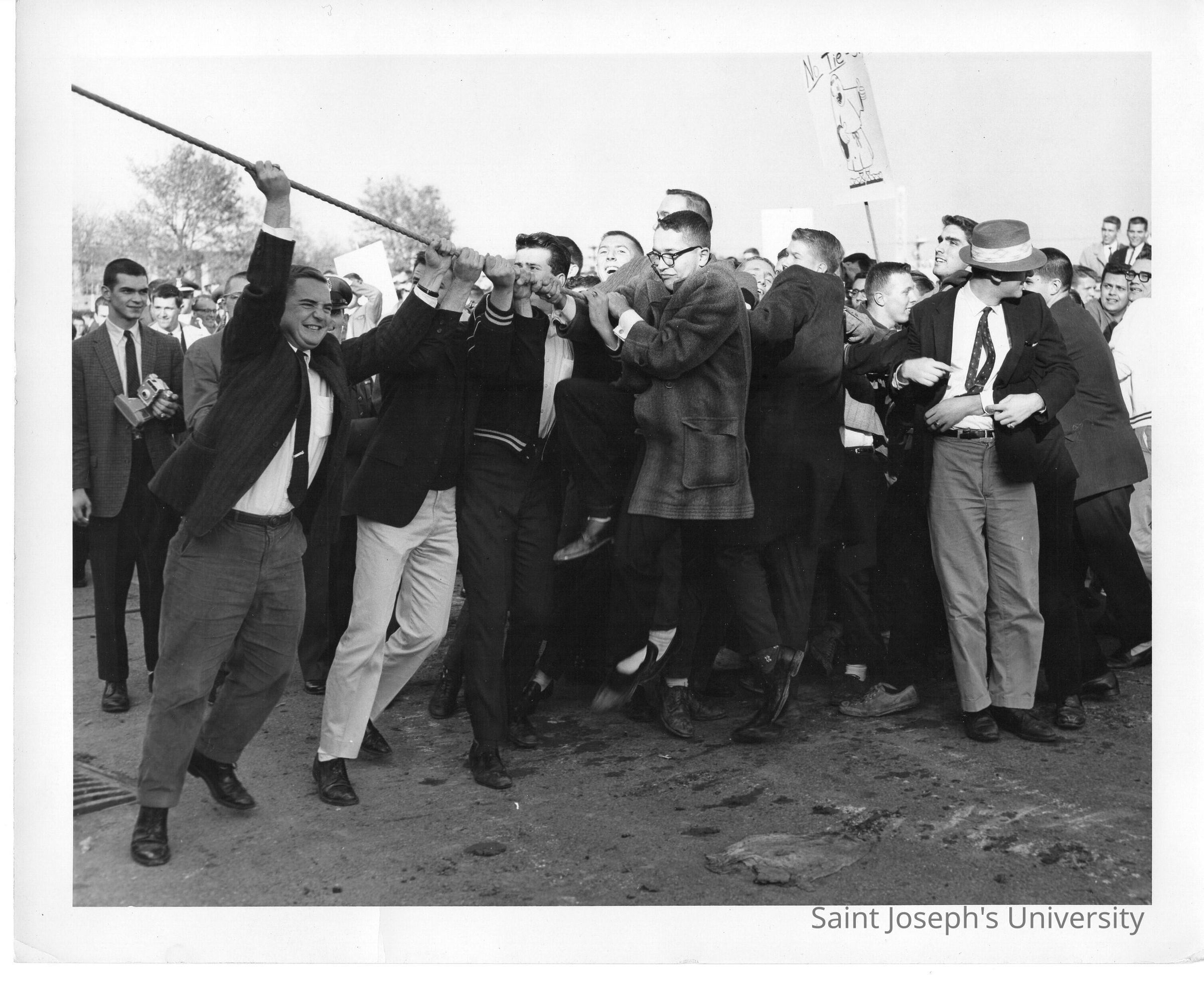 Students pulling down Cardboard College also known as Barbelin Annex.