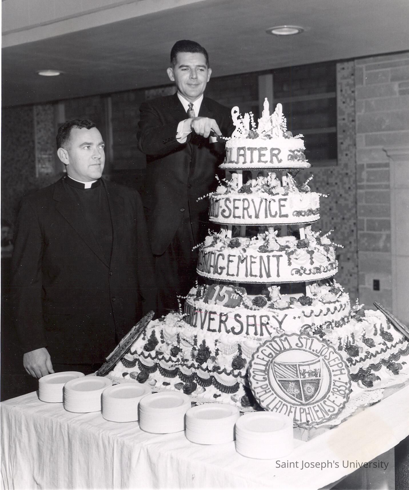 Dedication of Campion and cafeteria. William F. Deal of Slater Food Service and Paul F. X. Leary, S.J. at cake-cutting.