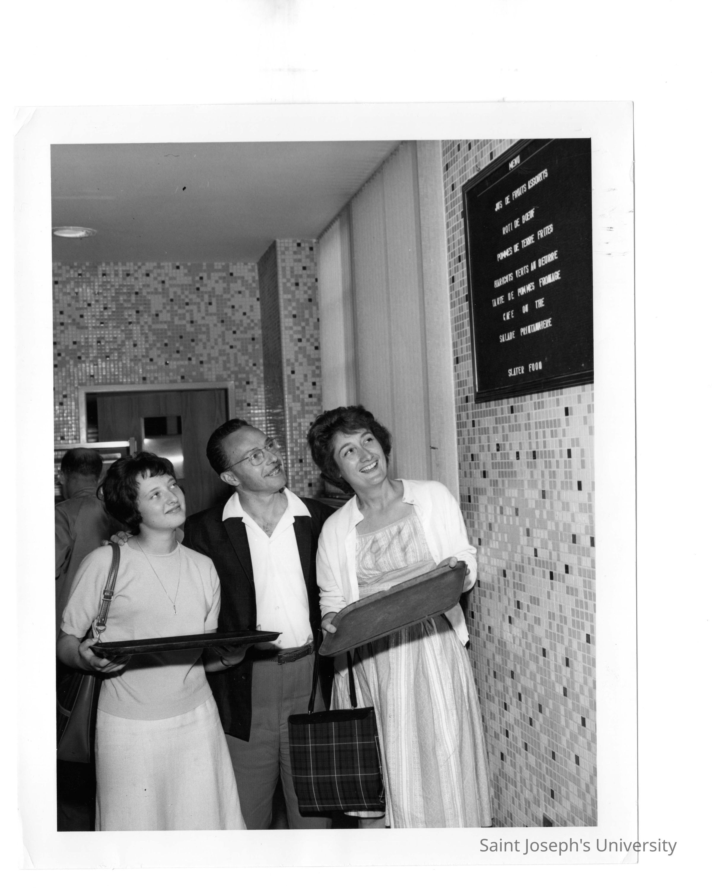 Man and two women holding trays looking at menu on wall of Campion cafeteria.