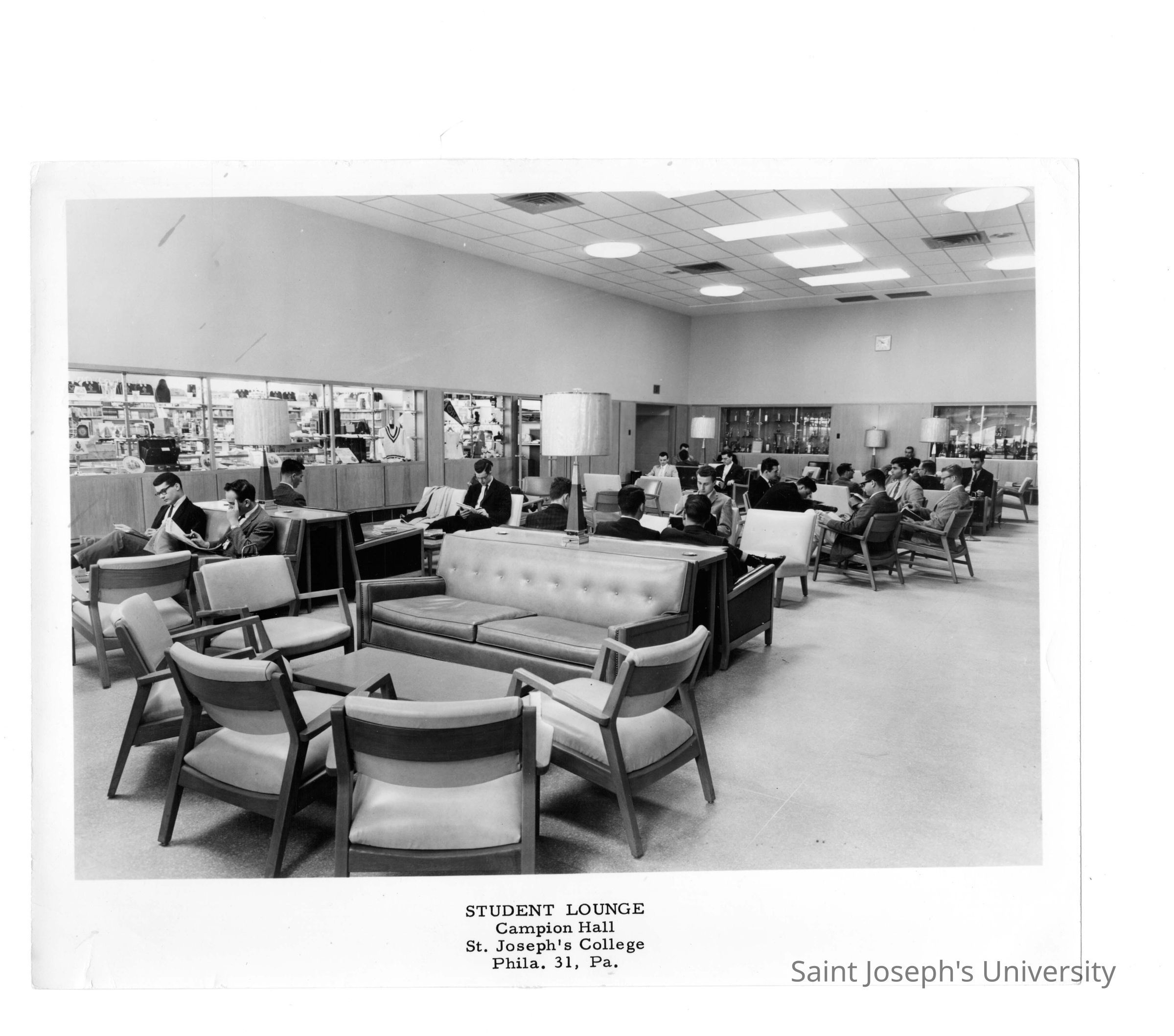 Students in sitting in Campion lounge with bookstore in background.