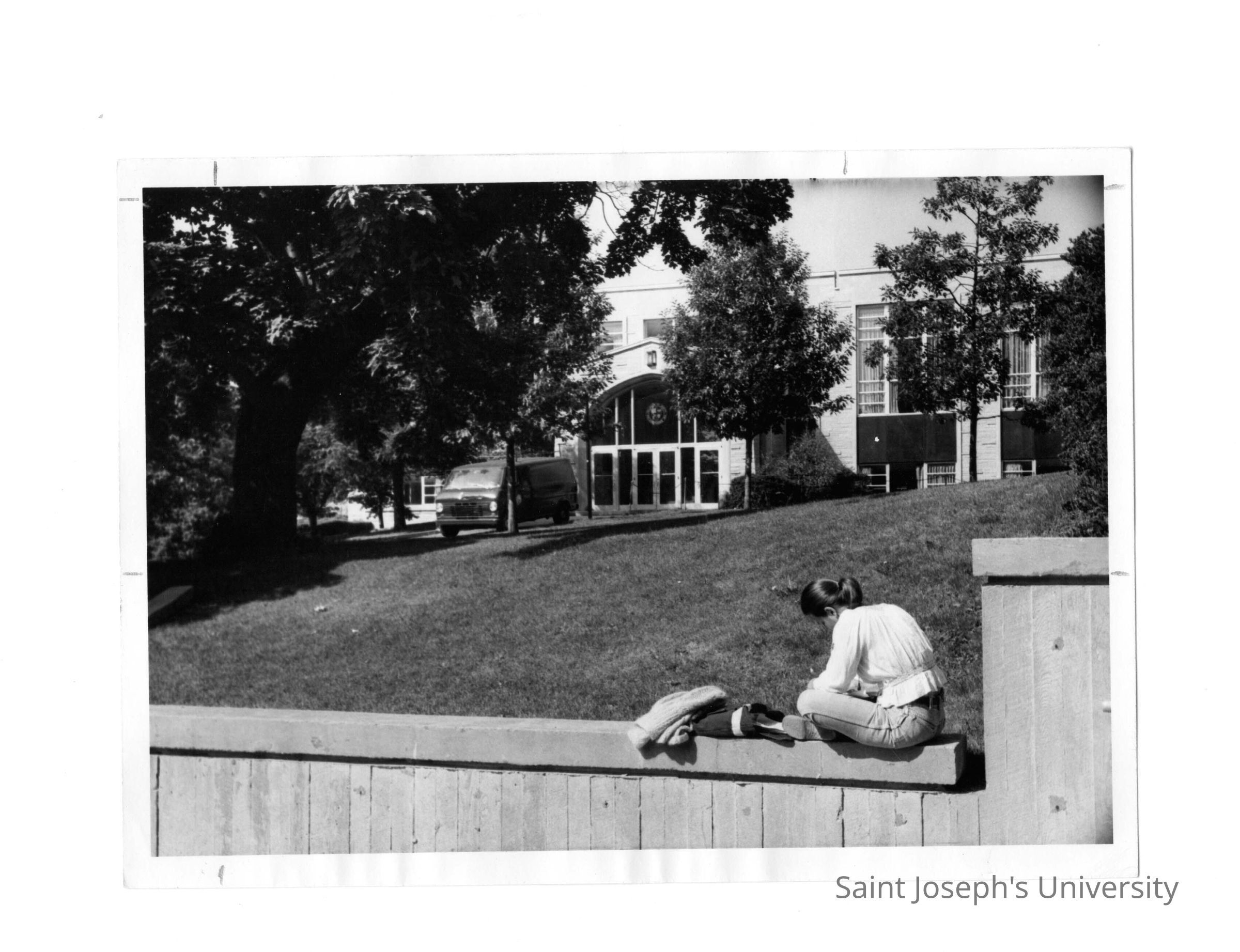 Exterior front view of Campion with student sitting on wall and van.