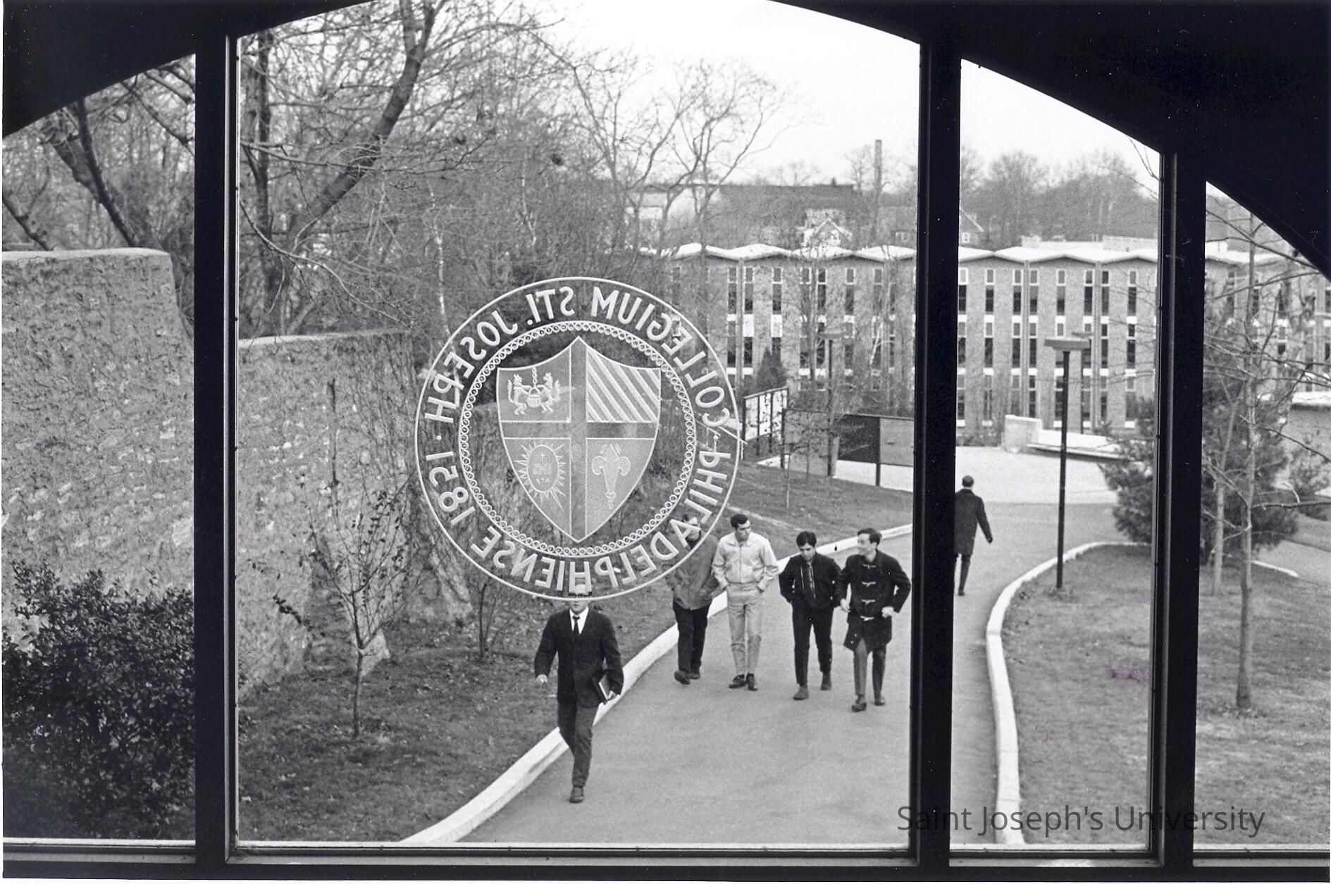 View of students walking alongside Gest estate wall toward Campion with Bellarmine in background. (Photo taken from inside Campion).