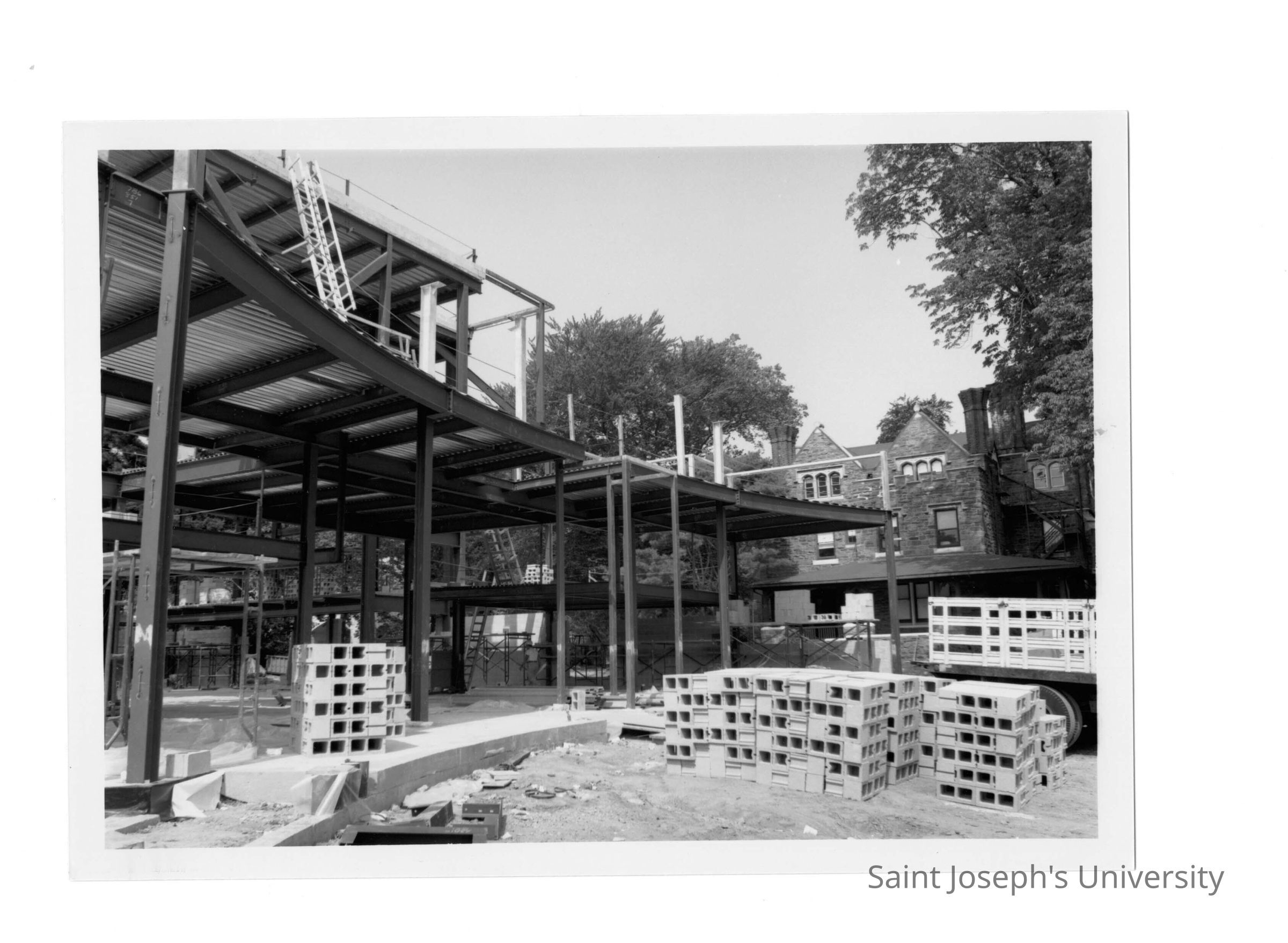 Exterior of view of early construction of Chapel of Saint Joseph with Wolfington Hall in background.