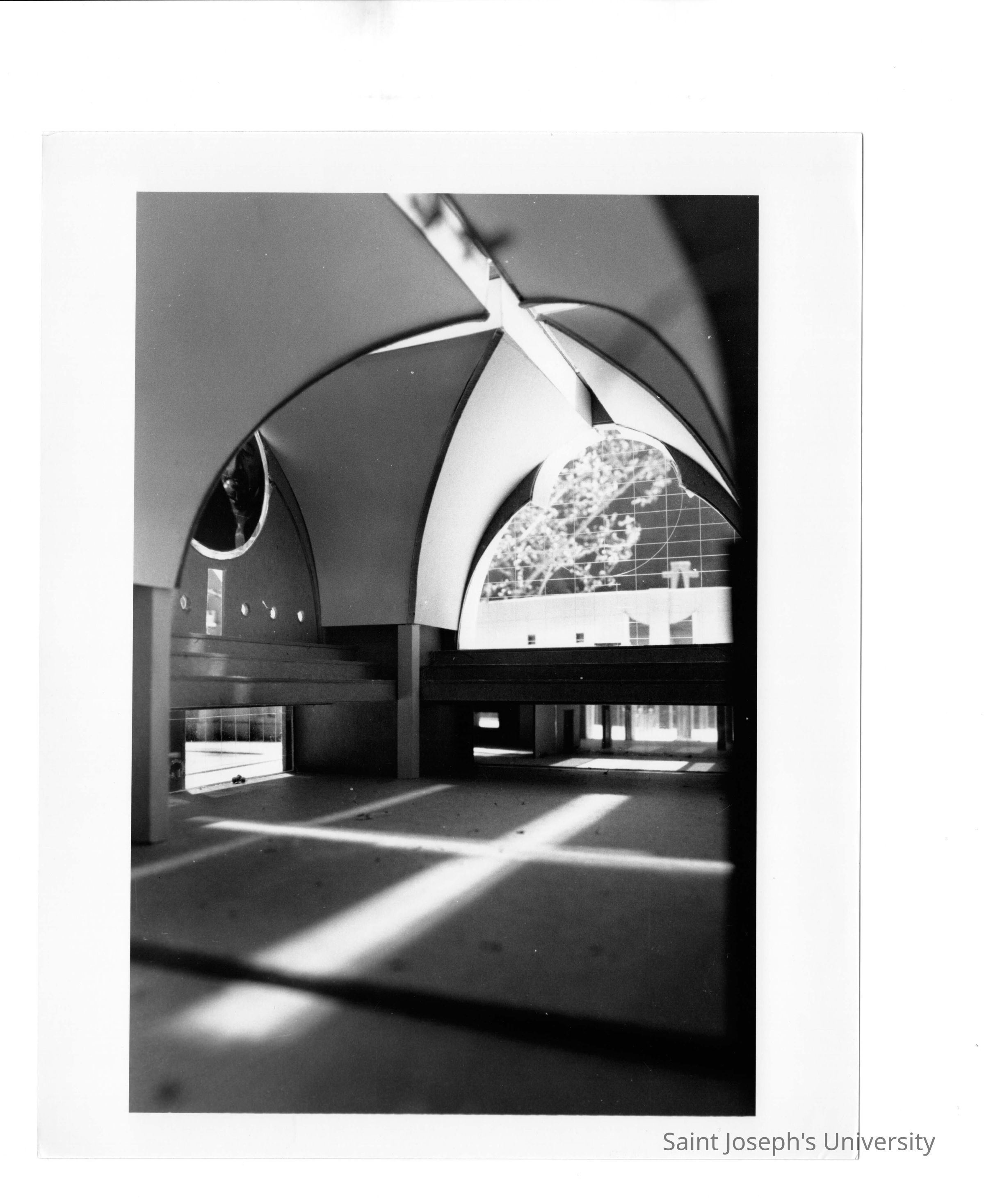 Interior view fo Chapel of Saint Joseph with daylight reflecting cross on floor.