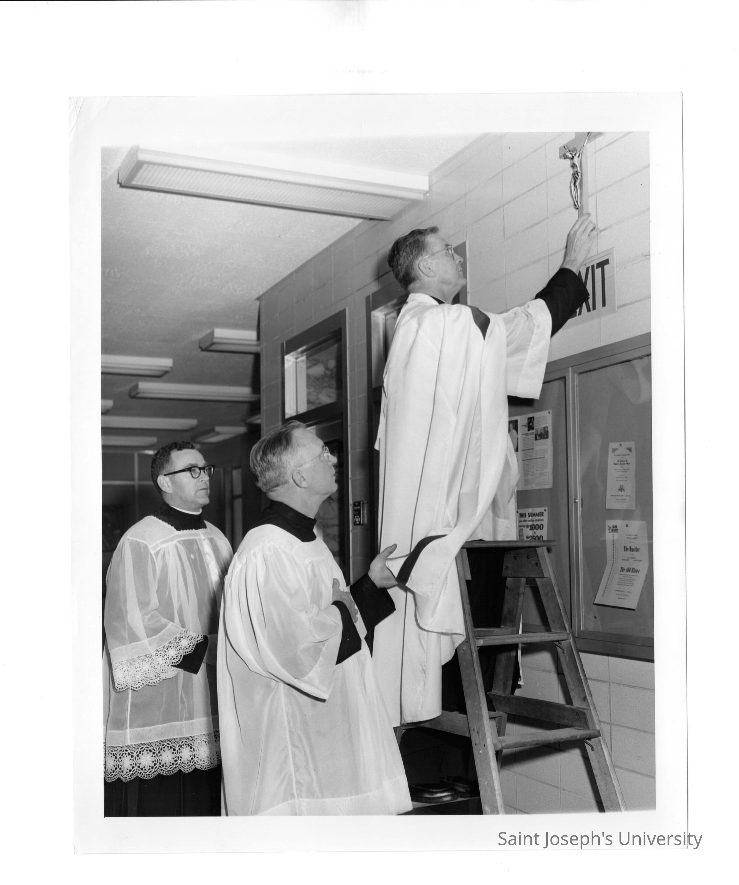 William F. Maloney, S.J. and others placing cross on wall of Drexel Library during dedication ceremony.