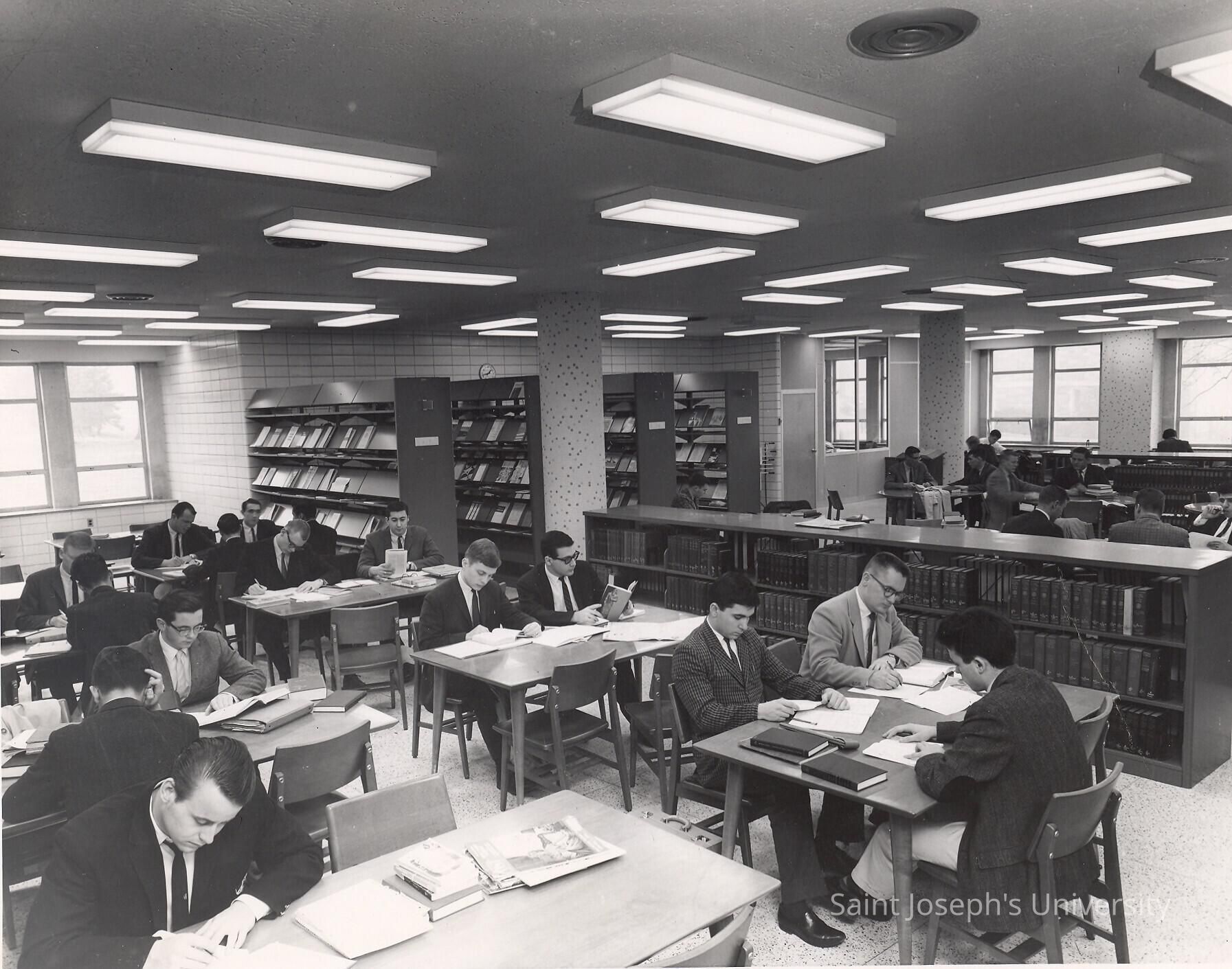 Interior view of reading room in Drexel Library with students studying at desks.