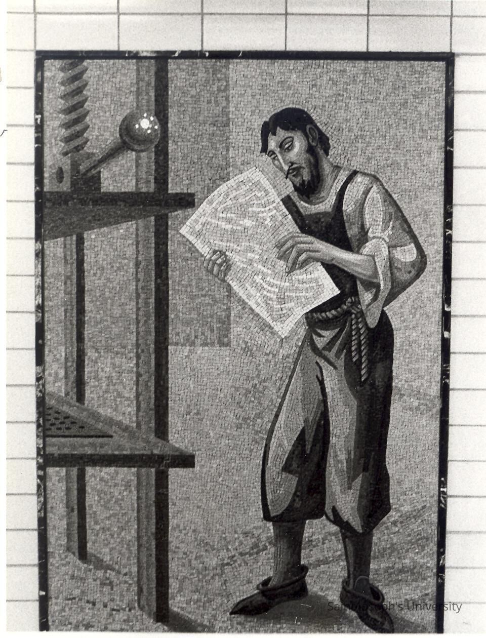 View of mosaic depicting Gutenberg and the printing press on wall in Drexel Library.