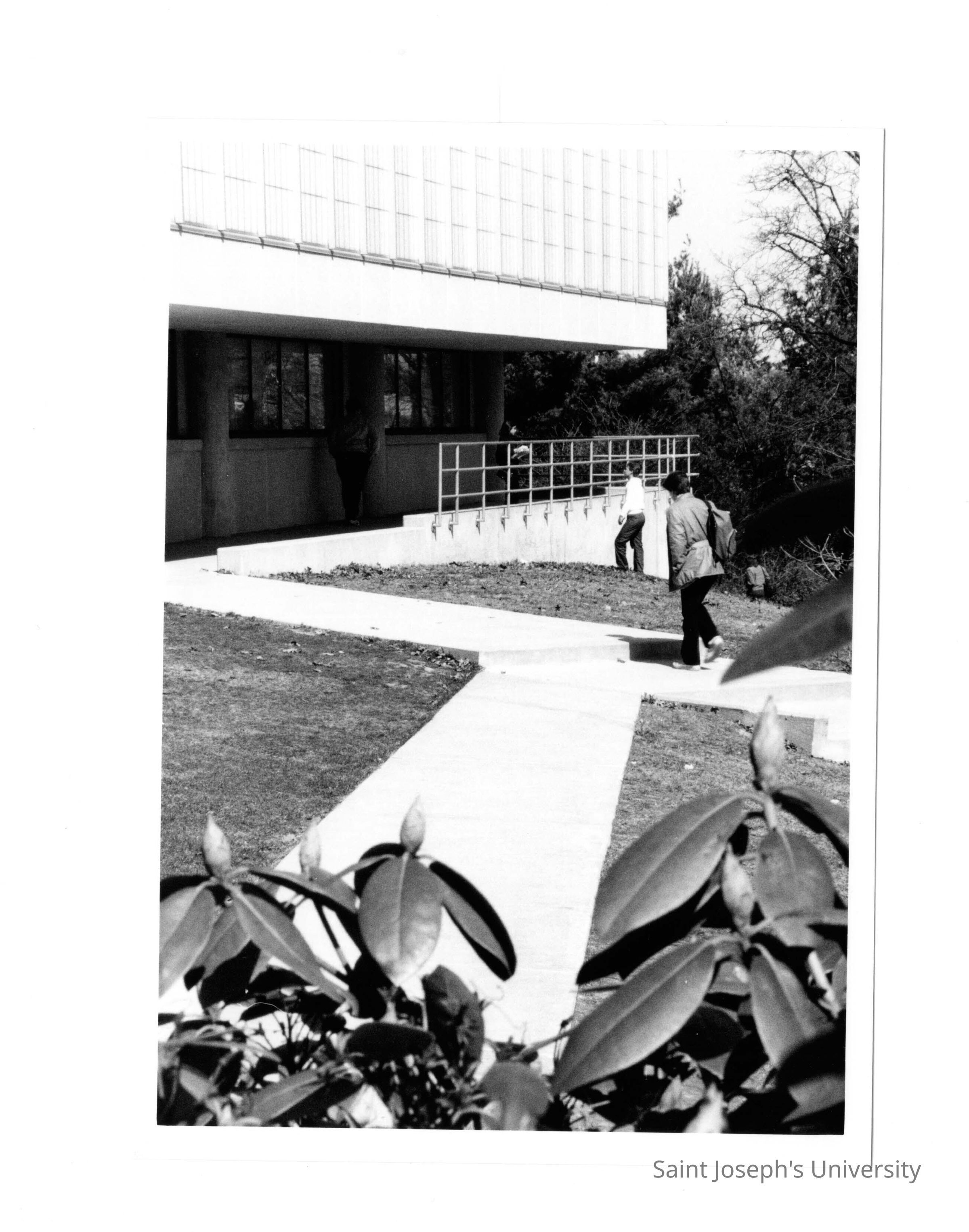 Exterior side view of addition (new wing) of Drexel Library with students walking alongside.
