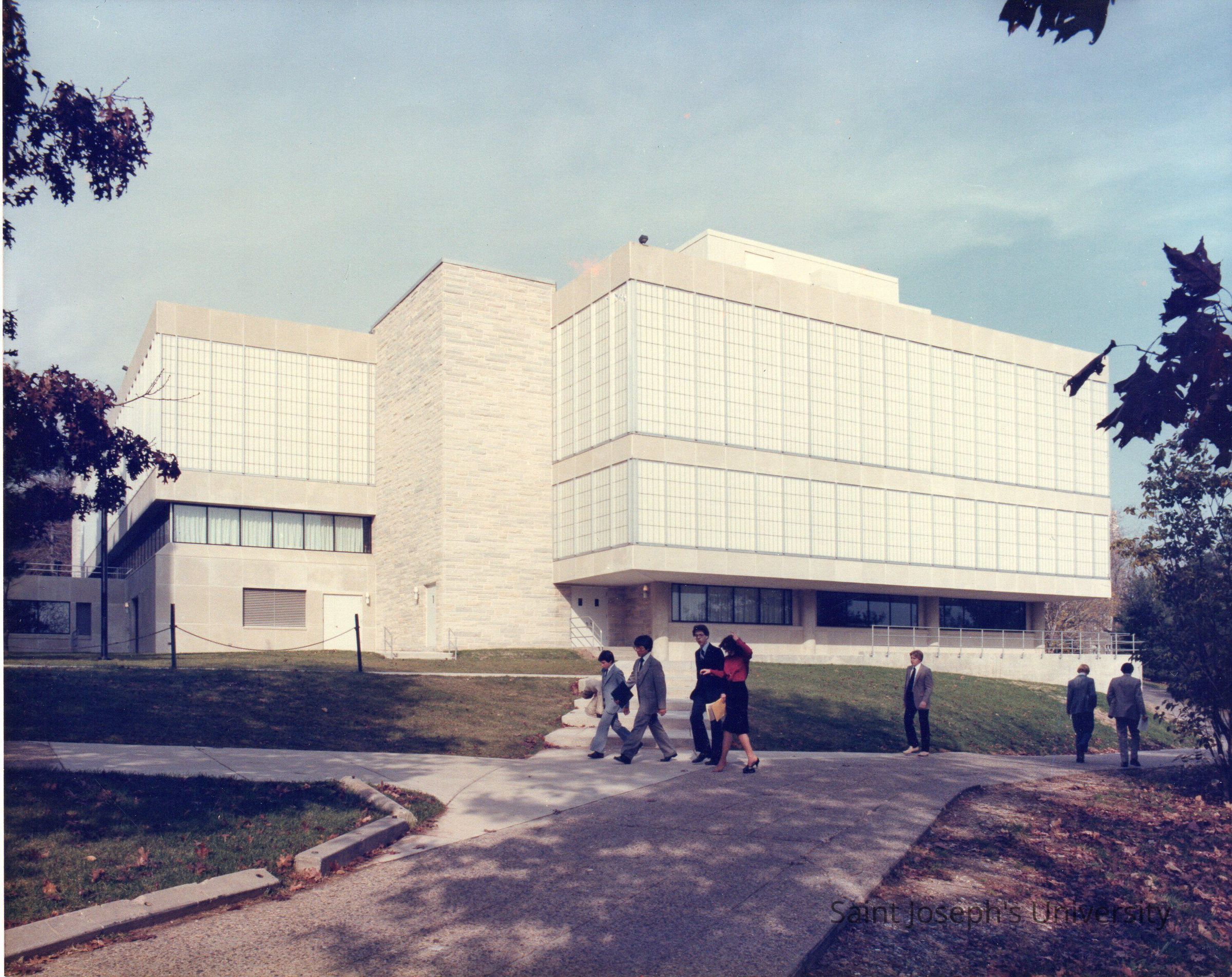 Exterior rear view of new wing or addition of Drexel Library with students walking by.