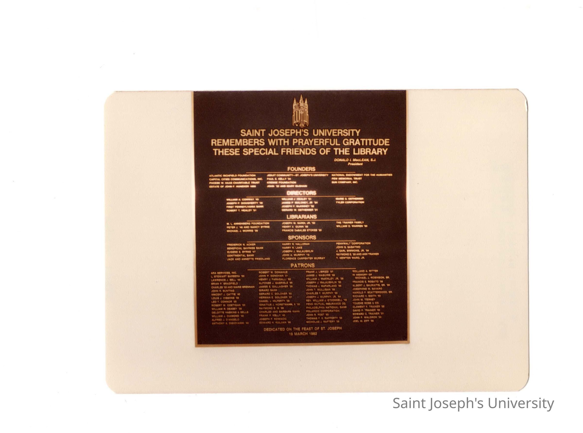 Plaque honoring founders, directors, librarians, sponsors, and patrons of Drexel Library.