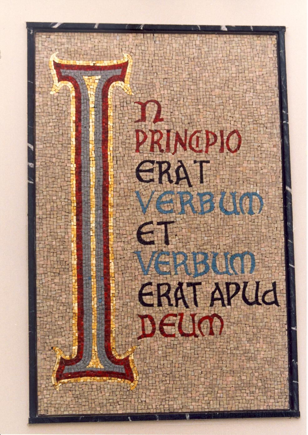 Mosaic in Drexel Library with words, "In Principio erat Verbum et Verbum erat apud Deum."