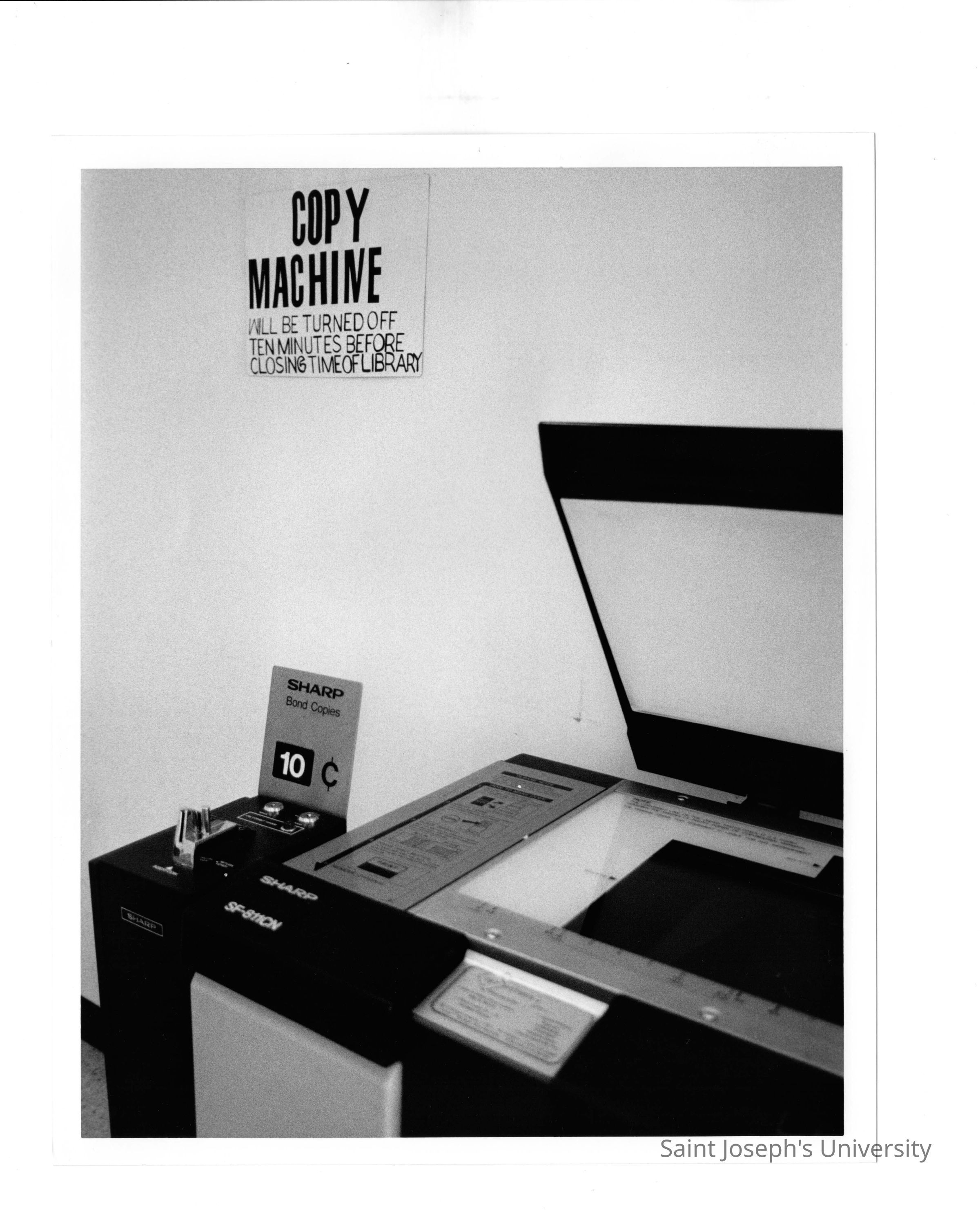 View of copy machine in Drexel Library with sign indicating ten cents per copy.