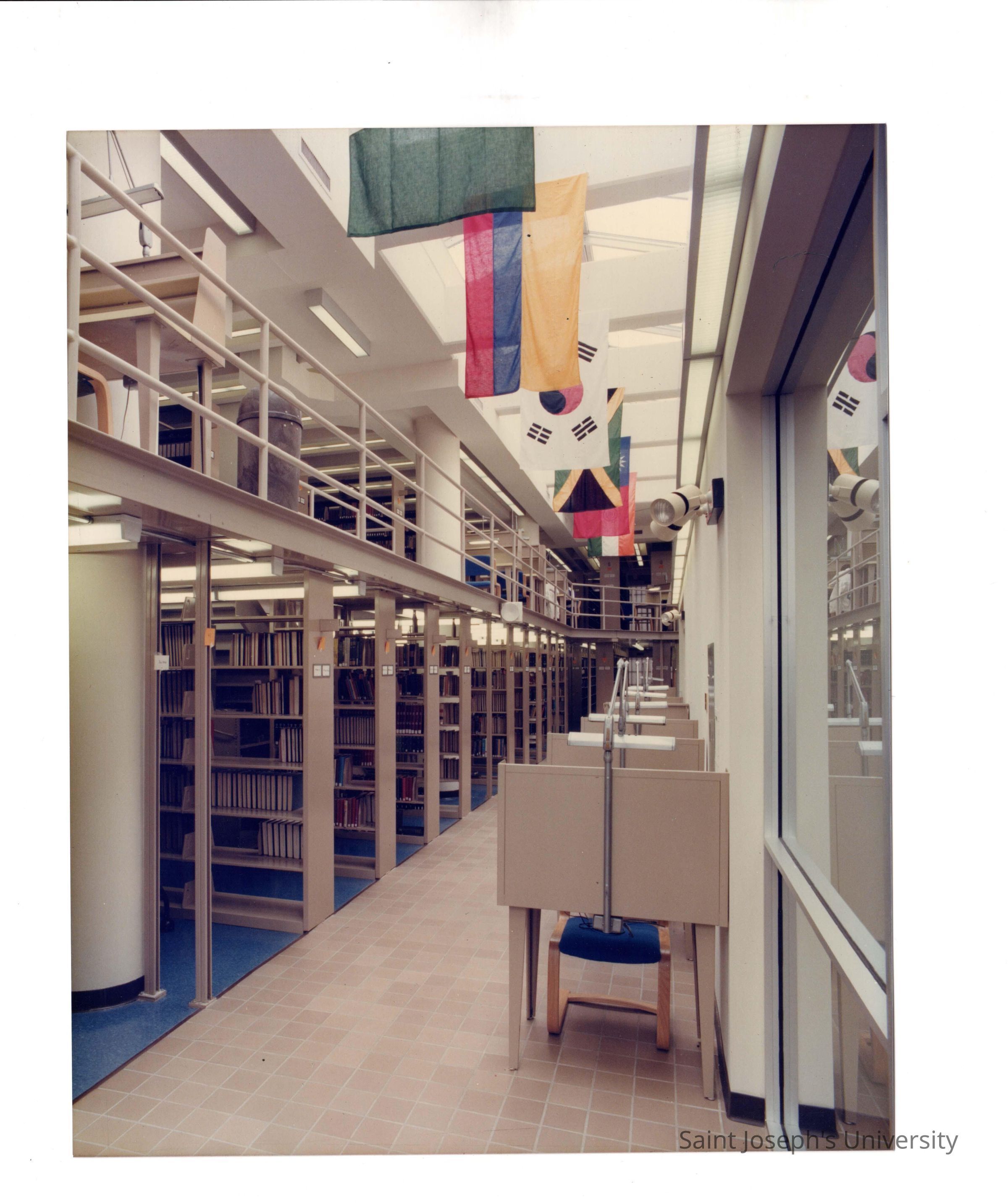 View of upper level stack, study desks, and flags in Drexel Library.