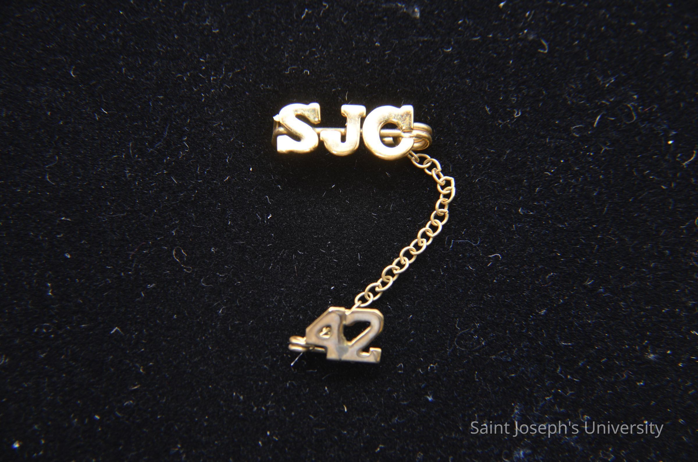 Commemorative gold plated pin on original paper backing. The "SJC" pin connects to "42" with chain. The backing notes "GOLD PLATE BALE PIN COMPANY DORCHESTER CENTER MASSACHUSETTS."Made/Created