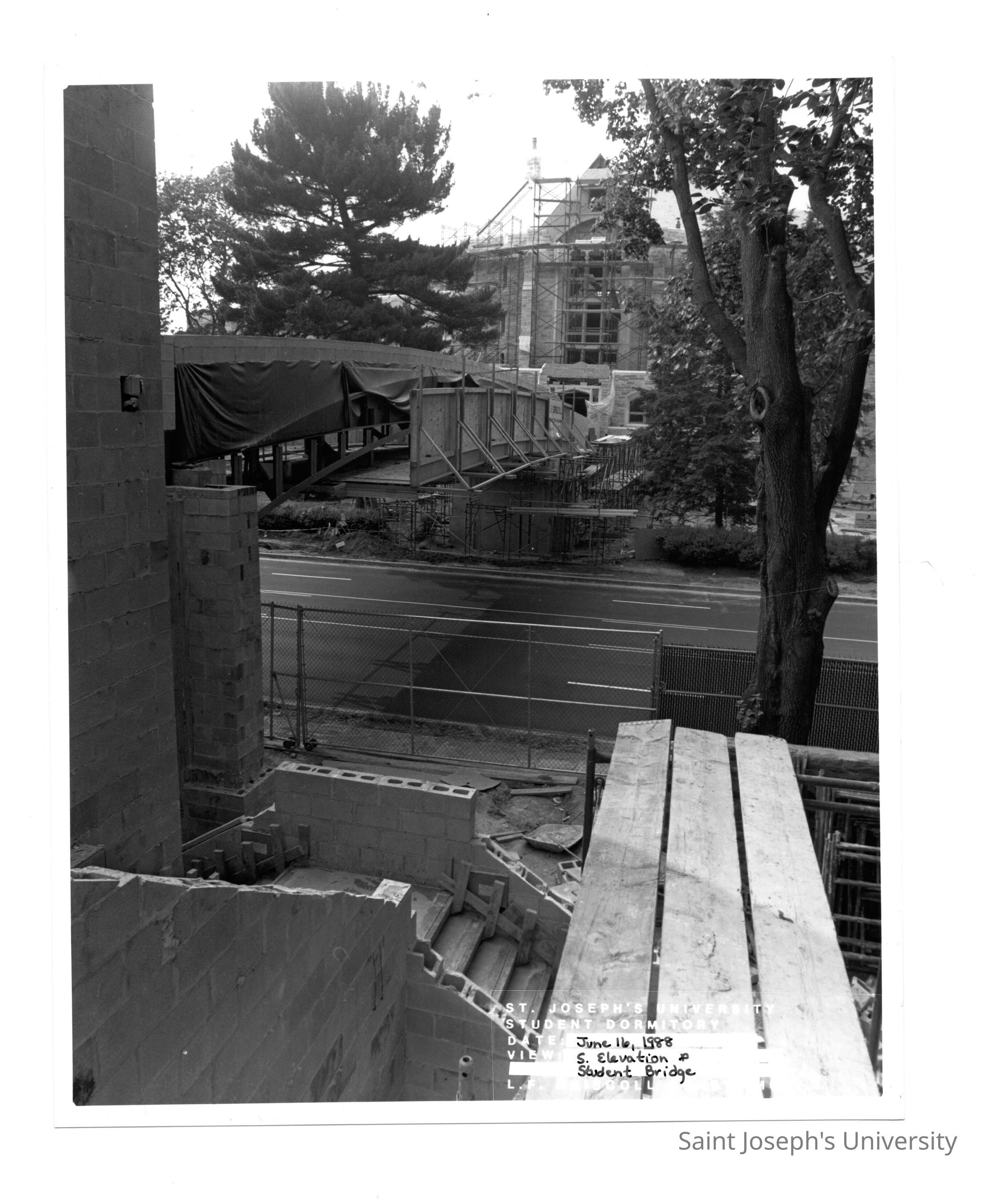Complete view of pedestrian bridge to McShain Hall under construction.