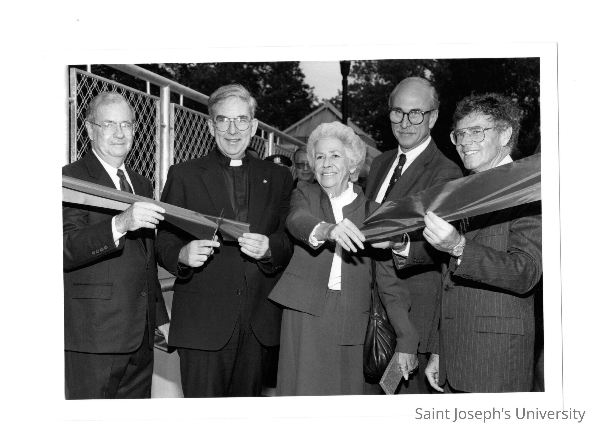Ribbon cutting for pedestrian bridge to McShain Hall with Nicholas S. Rashford, S.J., Mary McShain, Michael Morris and others.