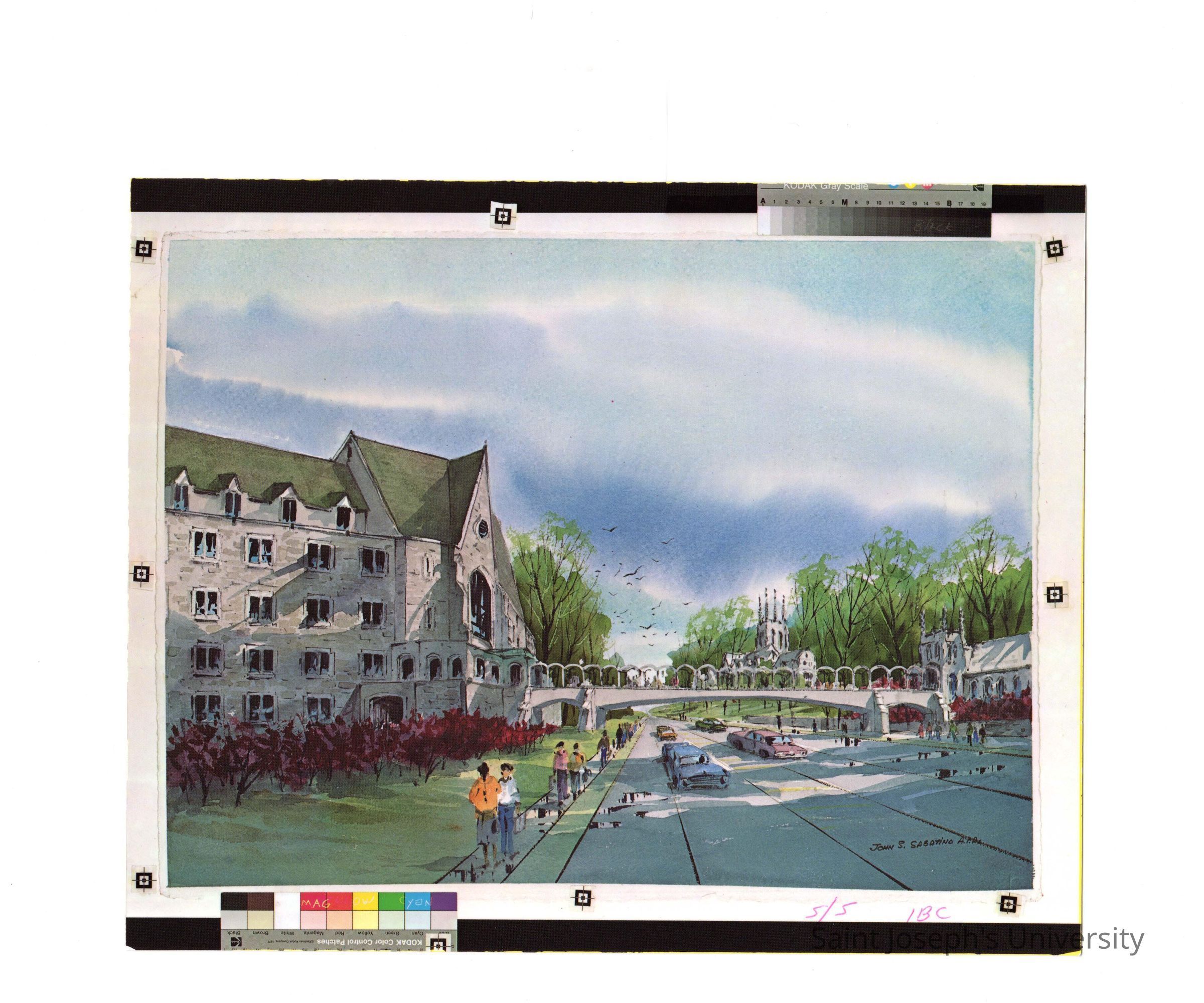 Architect's sketch ofd McShain Hall and pedestrian bridge by John Sabatino architect.