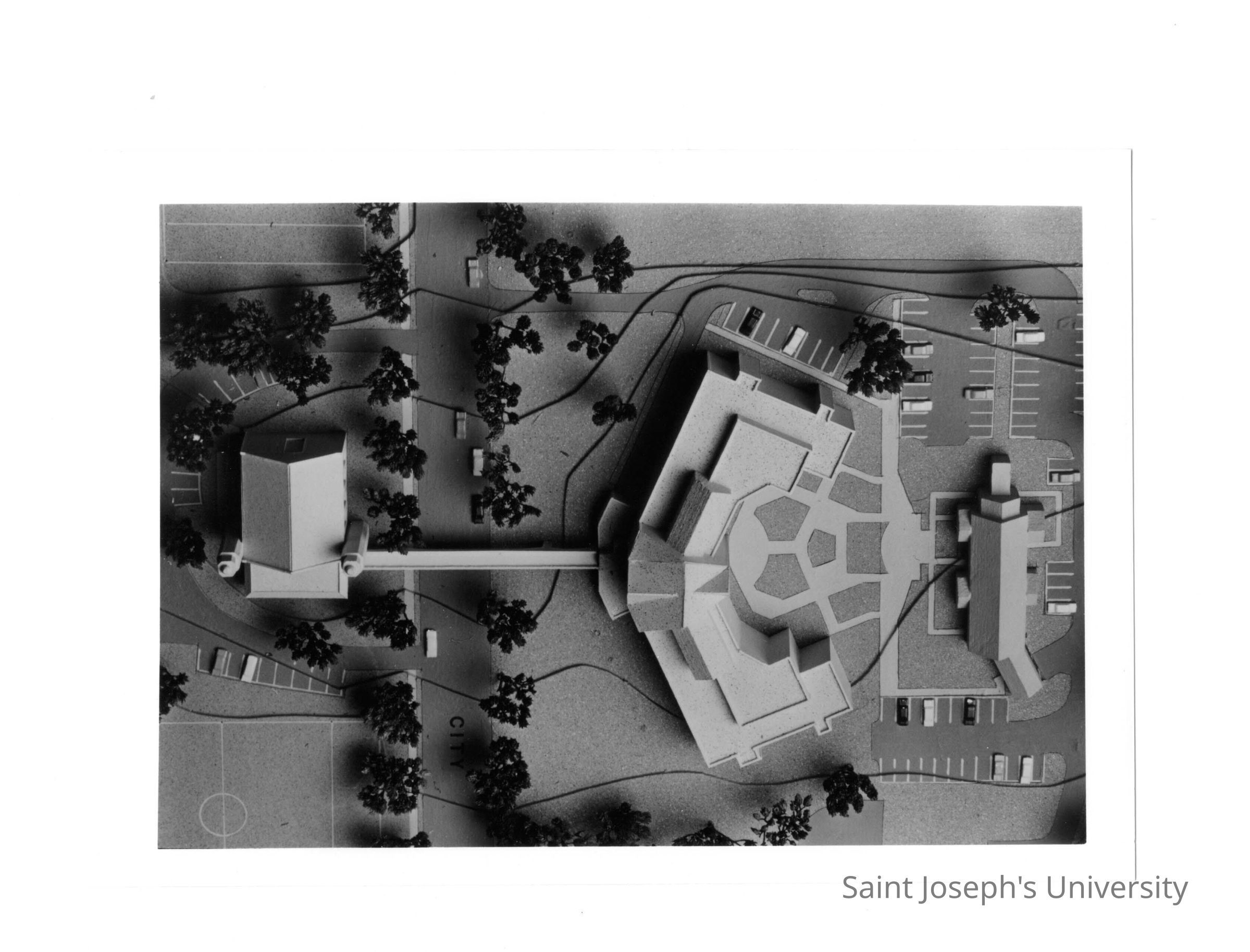 Aerial view of model of McShain Hall and pedestrian bridge.