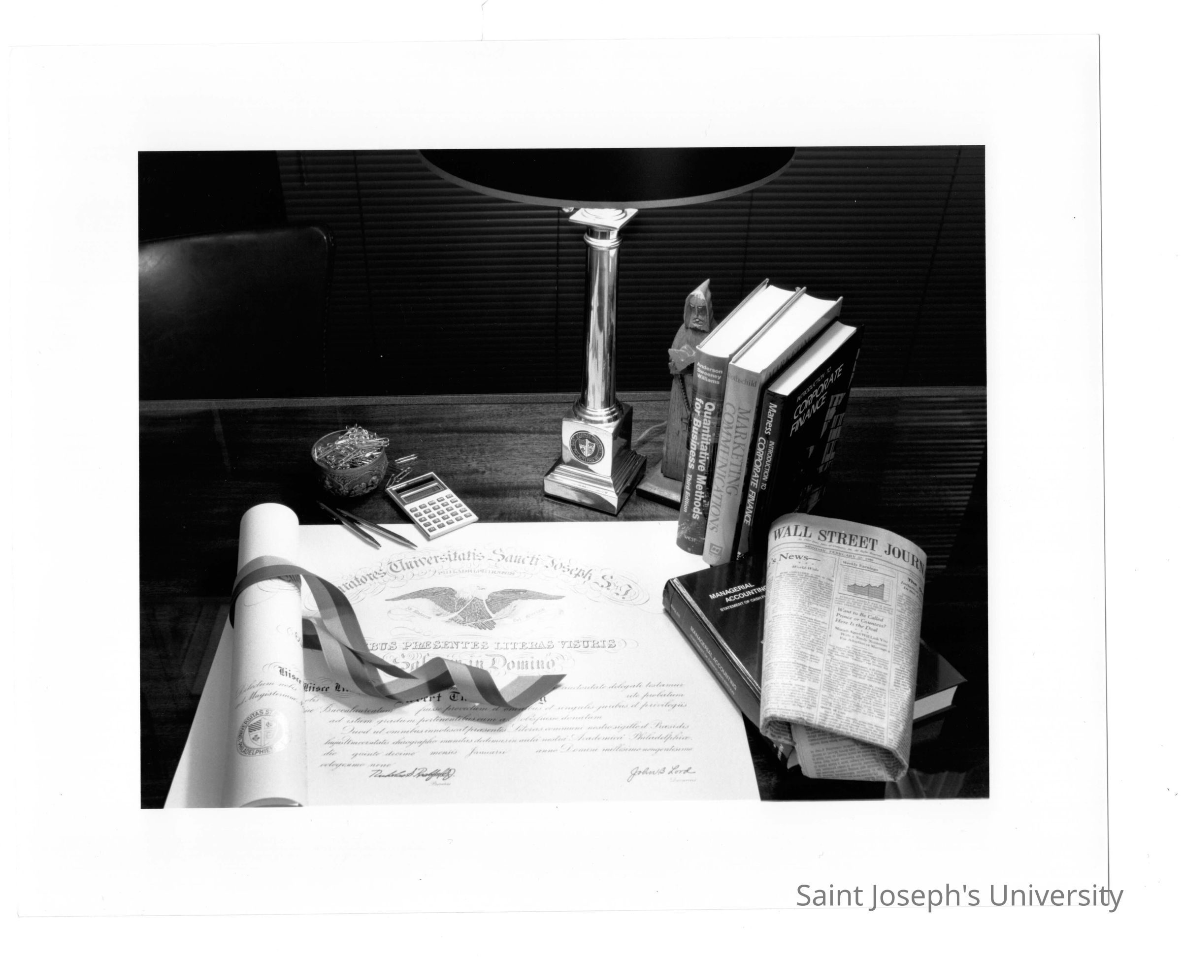 View of desk in Haub Executive Center, McShain Hall with accounting textbooks, diploma, and copy of Wall Street Journal newspaper