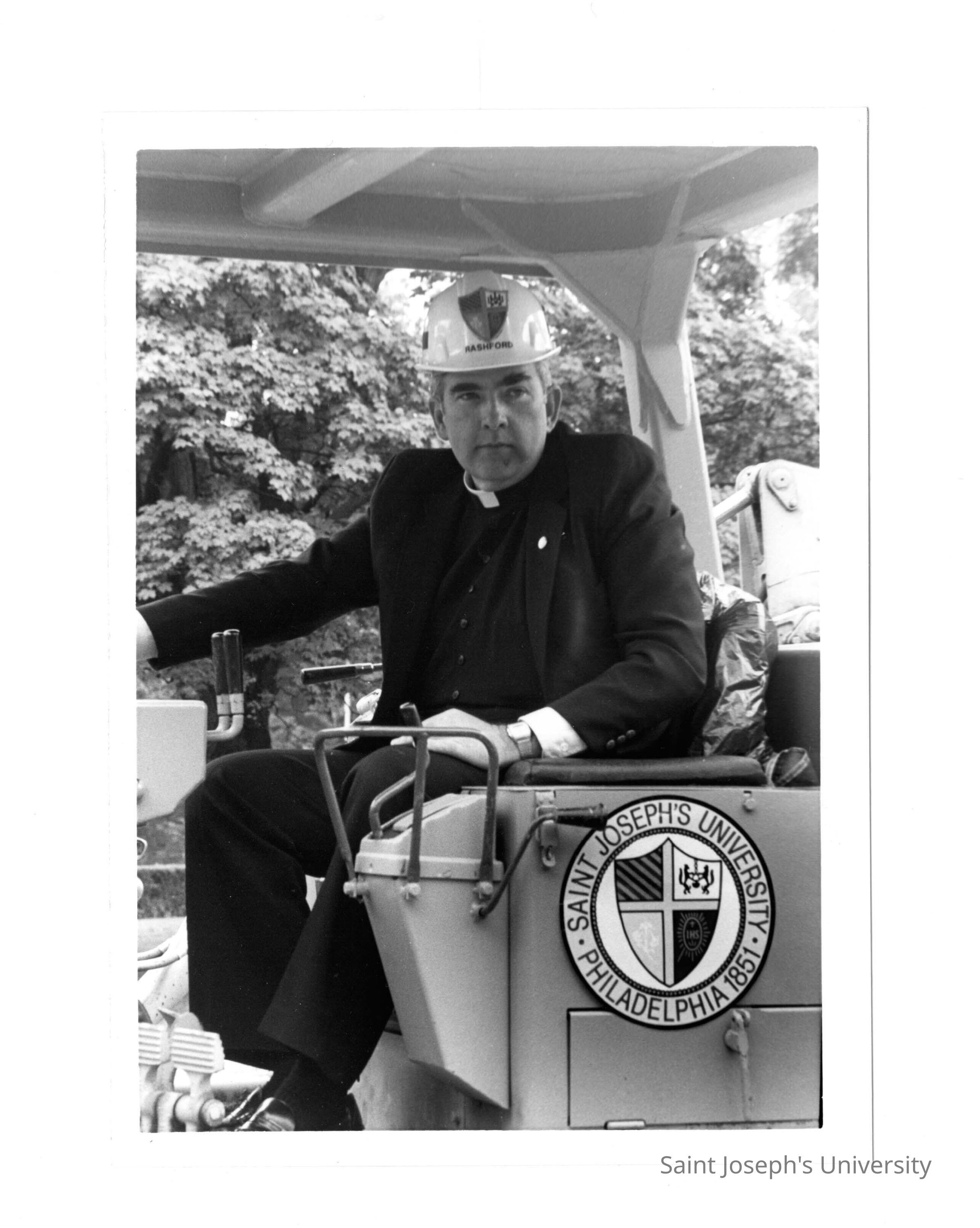 Nicholas S. Rashford, S.J. on Caterpillar bulldozer at McShain Hall groundbreaking.