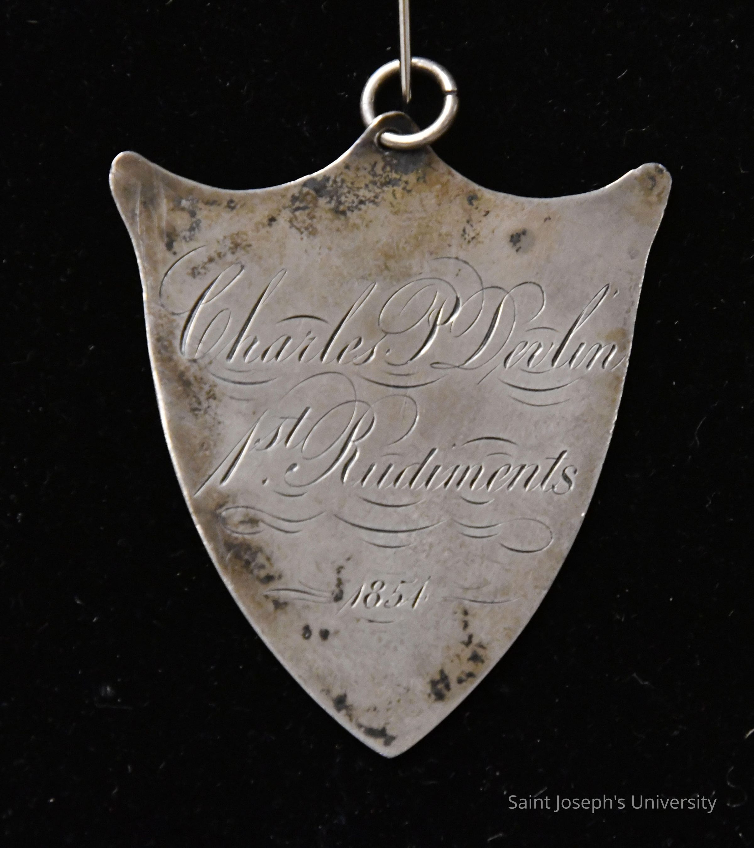 Silver shield medal. Front: "CHARLES P. DEVLIN 1ST RUDIMENTS 1854." Back: "ST. JOSEPH'S COLLEGE PHA" with IHS monogram, cross, and sun burst emblem.