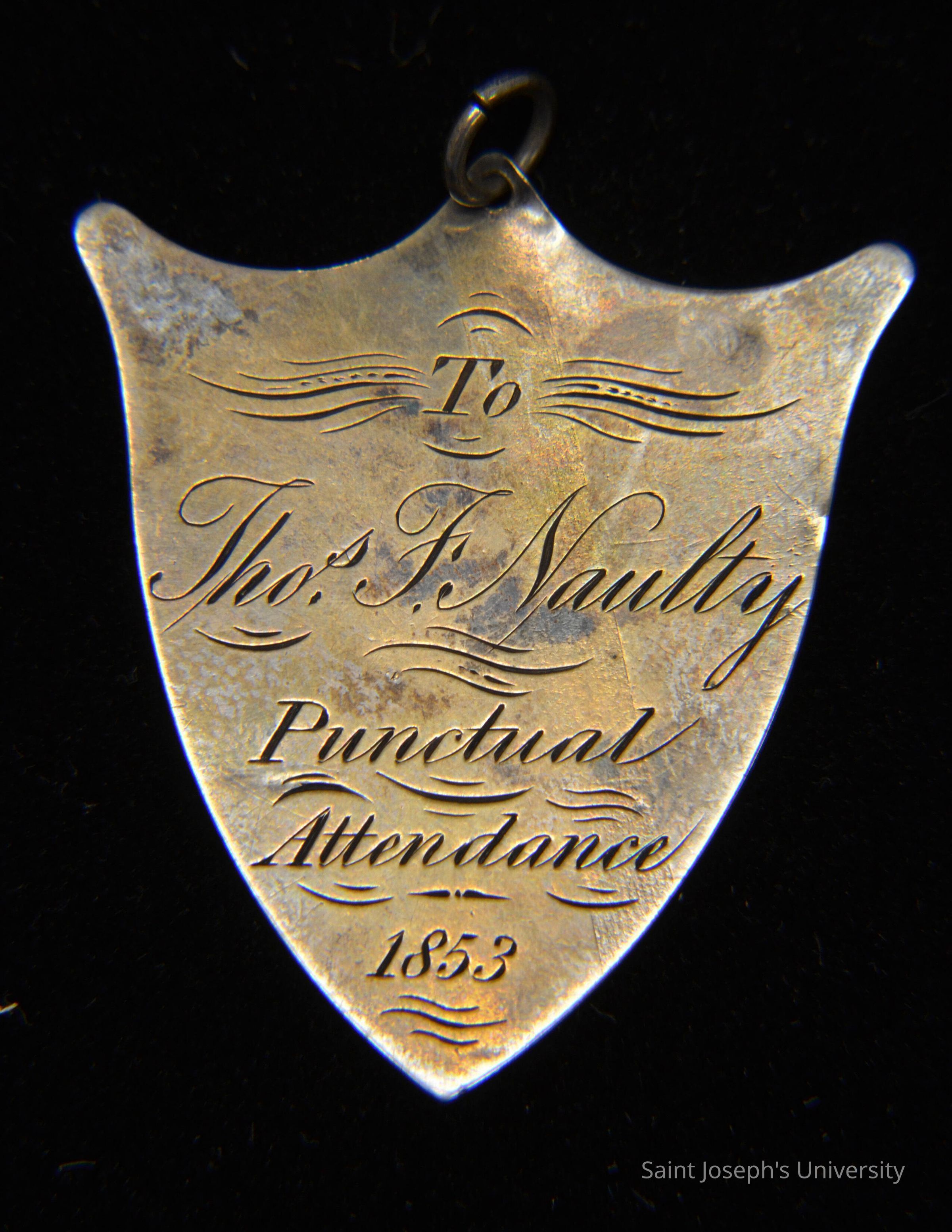 Silver shield medal. Front: "TO THOM. F.NAULTY PUNCTUAL ATTENDANCE 1853." Back: ST. JOSEPH'S COLLEGE PHA" with IHS monogram, cross, and sun burst emblem.