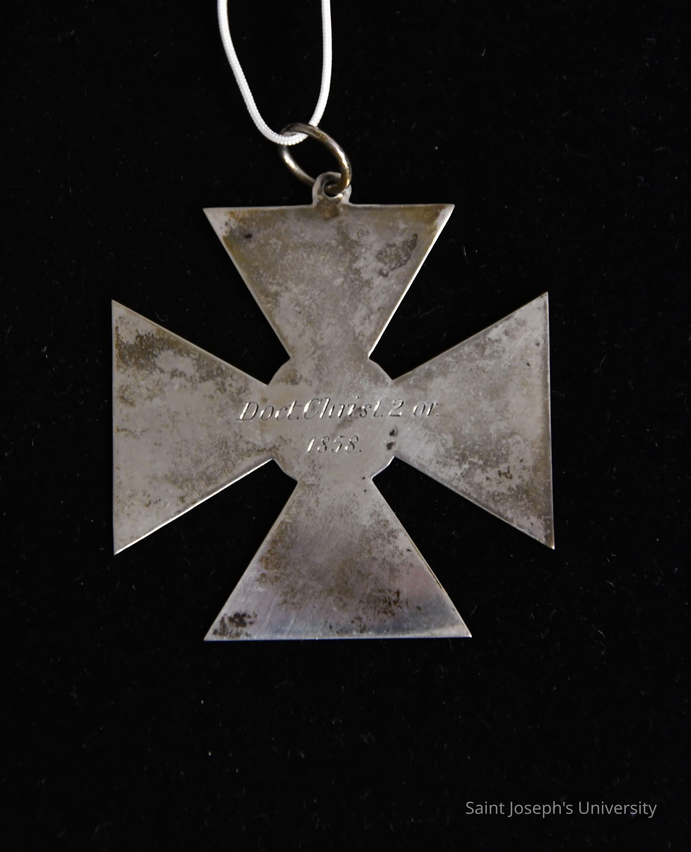 Silver cross medal with red and gray ribbon (not original). Front "DOCT. CHRIST. 2 OR. 1858." Back: "ST. JOSEPH'S COLLEGE."