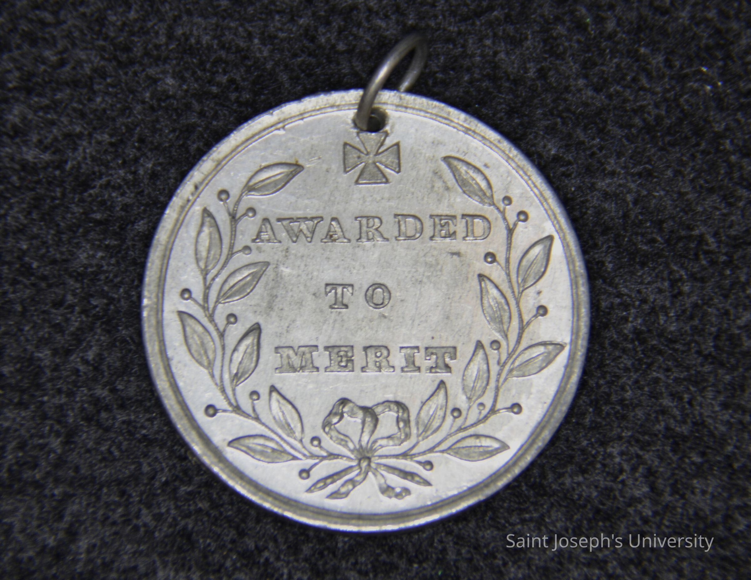 Three round silver medals honoring Sunday School Class in the 1850s and 1860s led by Felix Barbelin, S.J. Front: cross with heart with "ST. JOSEPHS SUNDAY SCHOOL" framing the image. Back: "AWARDED TO MERIT" with leaf detail.Made/Created