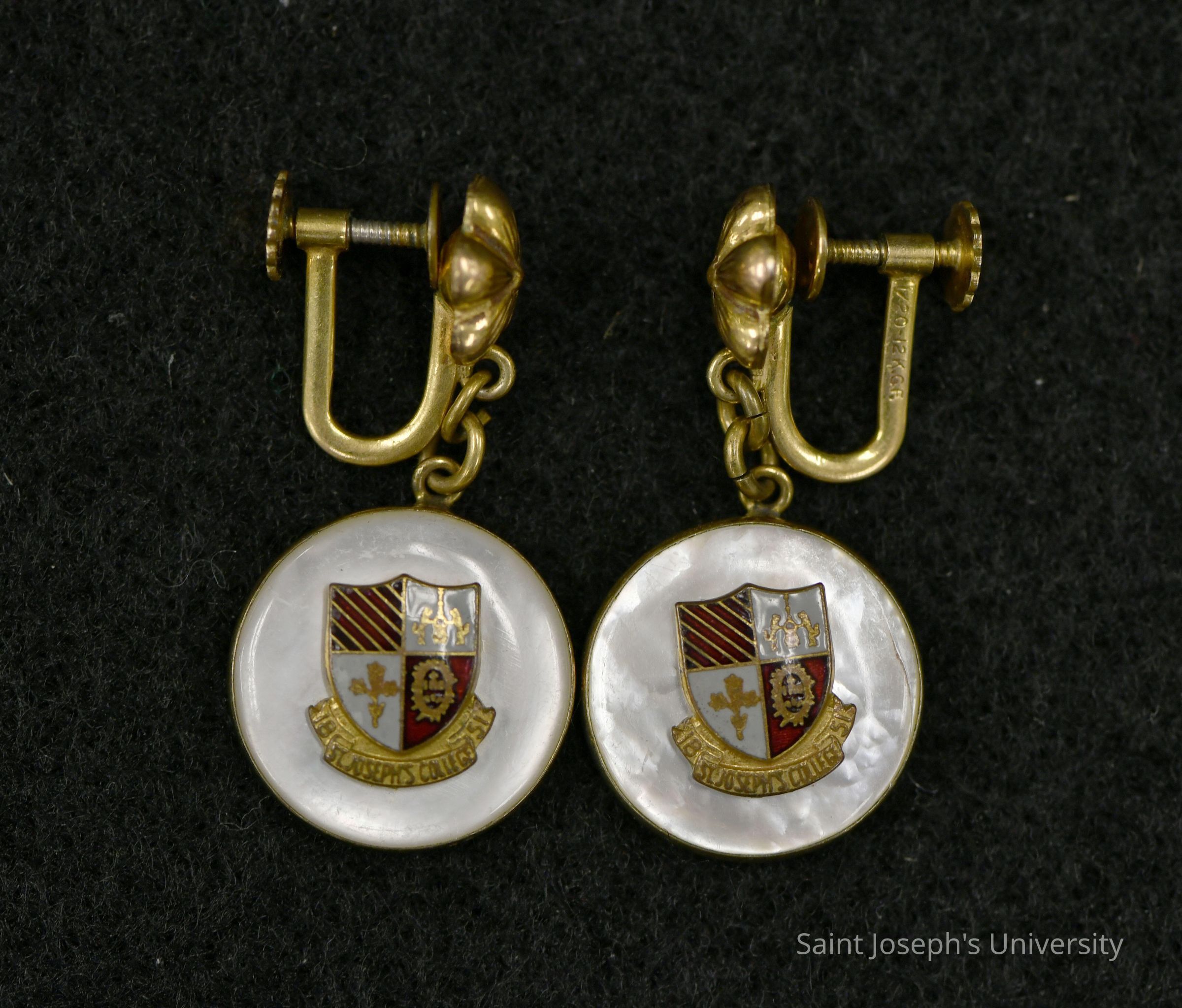 Pair of gold clasp earrings with SJC shield in Mother of Pearl. Eugene Delaney '58 gave them along with a bracelet to friend Patricia, who became his wife.