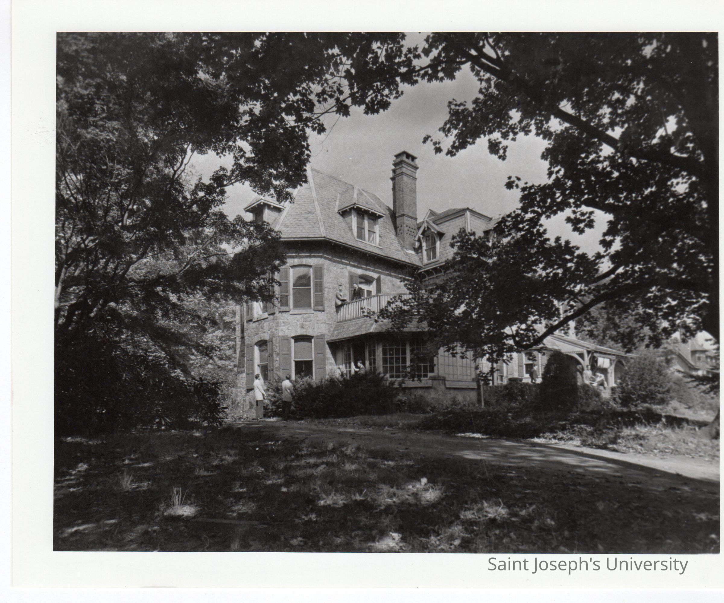 Exterior view of Quirk Hall with students on first floor and second floor porches.