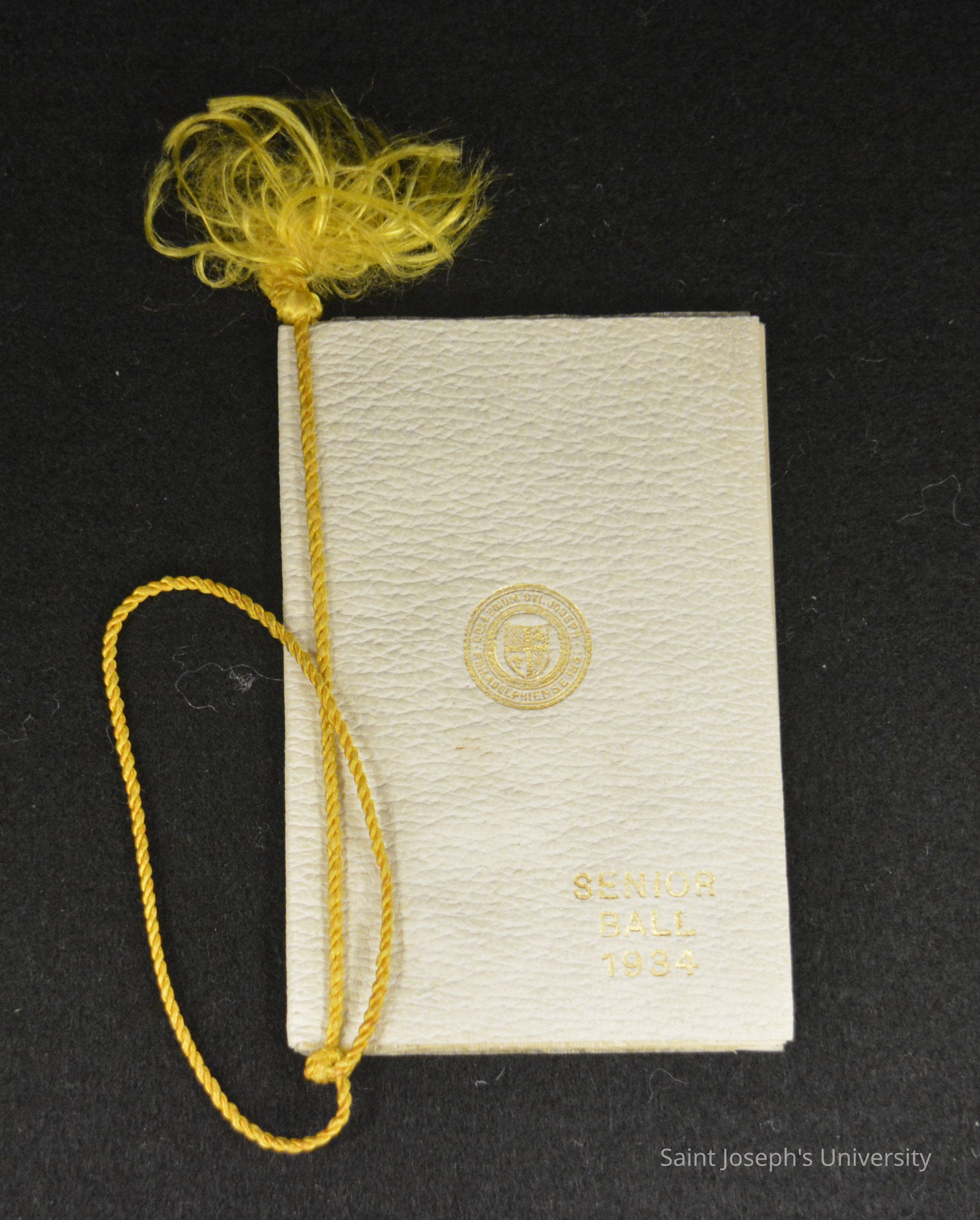 Leather and paper 1934 Senior Ball booklet with yellow tassel and SJC seal. May be associated with 2013.OB.0057.