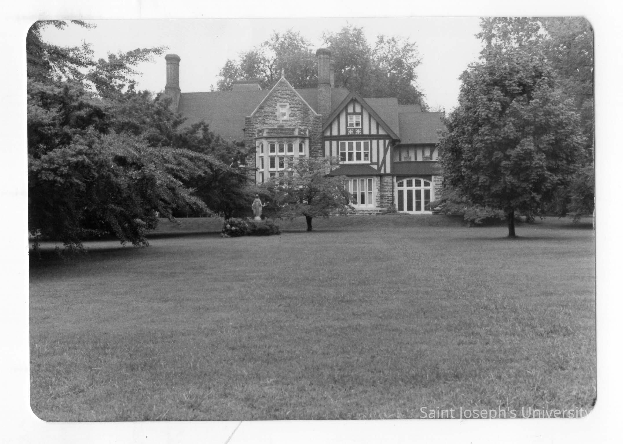 Exterior view of Saint Mary's Hall with statue of Mary in front.