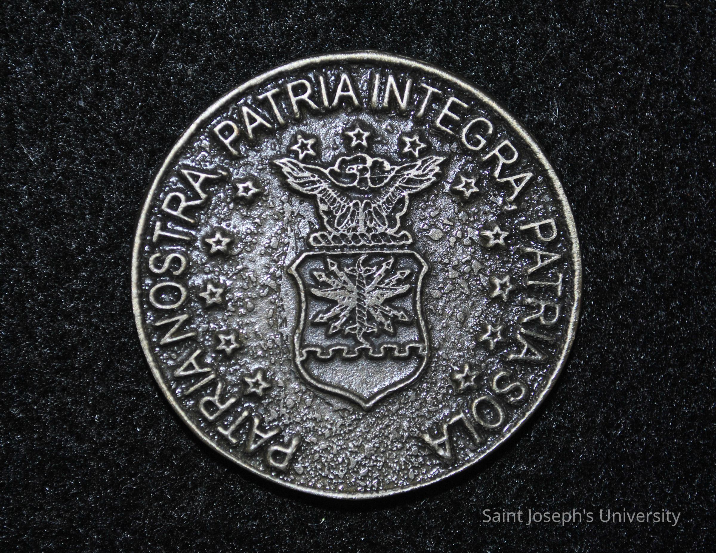 Metal 2011 coin commemorating Air Force Reserve Officer Training Corps. (AFROTC) Detachment 750 (SJU). One side includes the AFROTC seal with hawk and shield and the reverse side includes the Liberty Bell. Latin motto translated "Let our object be our country, our whole country, and nothing but our country" - Daniel Webster.Made/Created