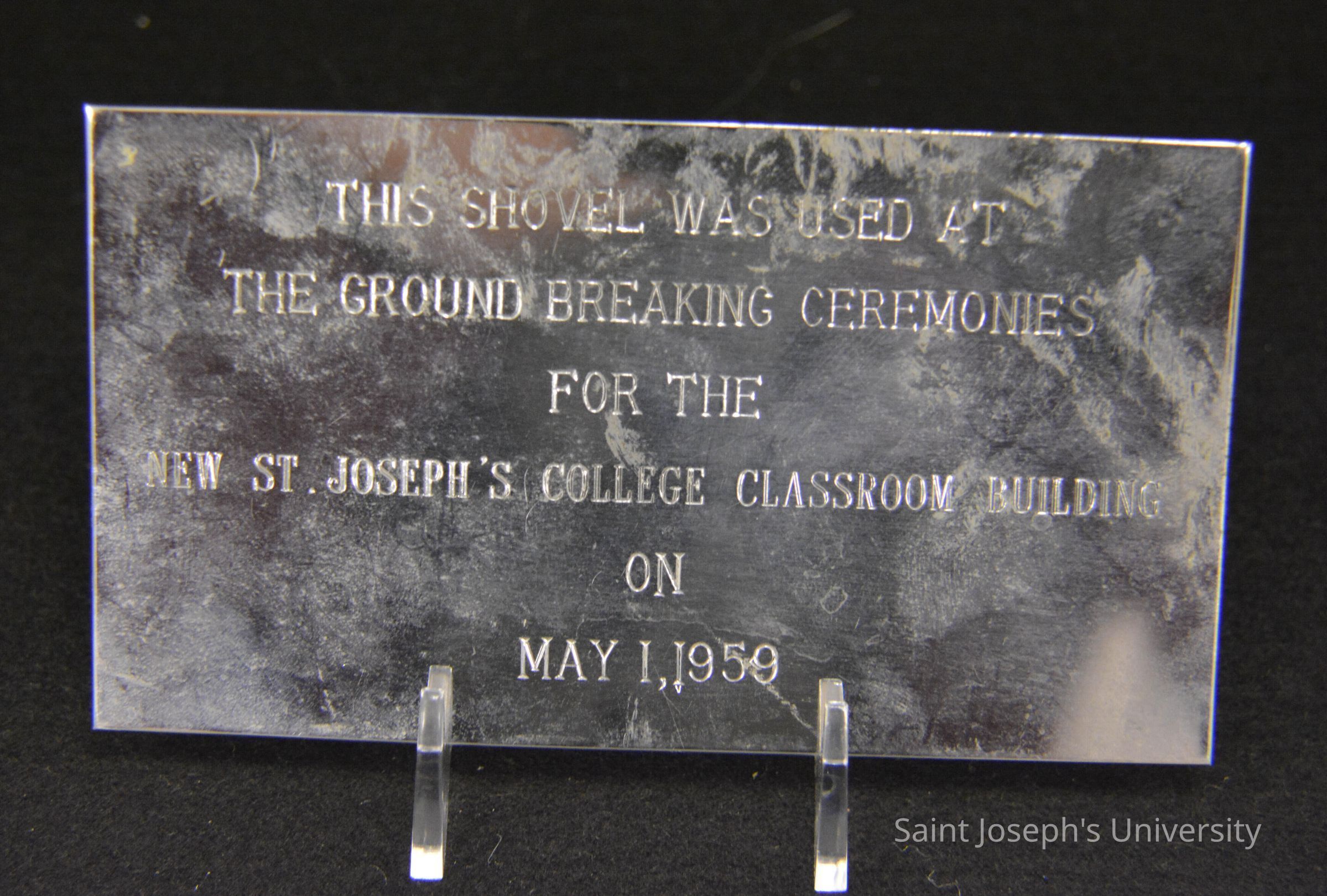 Silver rectangle shaped plate removed from shovel. "THIS SHOVEL WAS USED AT THE GROUND BREAKING CEREMONIES FOR THE NEW ST. JOSEPH'S COLLEGE CLASSROOM BUILDING ON MAY 1, 1959." Bellarmine Building.Made/Created
