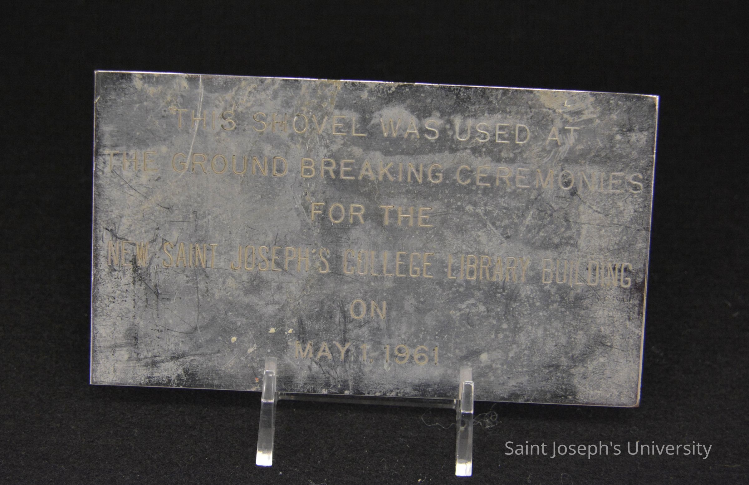 Silver rectangle shaped plate removed from shovel. "THIS SHOVEL WAS USED AT THE GROUND BREAKING CEREMONIES FOR THE NEW SAINT JOSEPH'S COLLEGE LIBRARY BUILDING ON MAY 1, 1961." Drexel Library.Made/Created