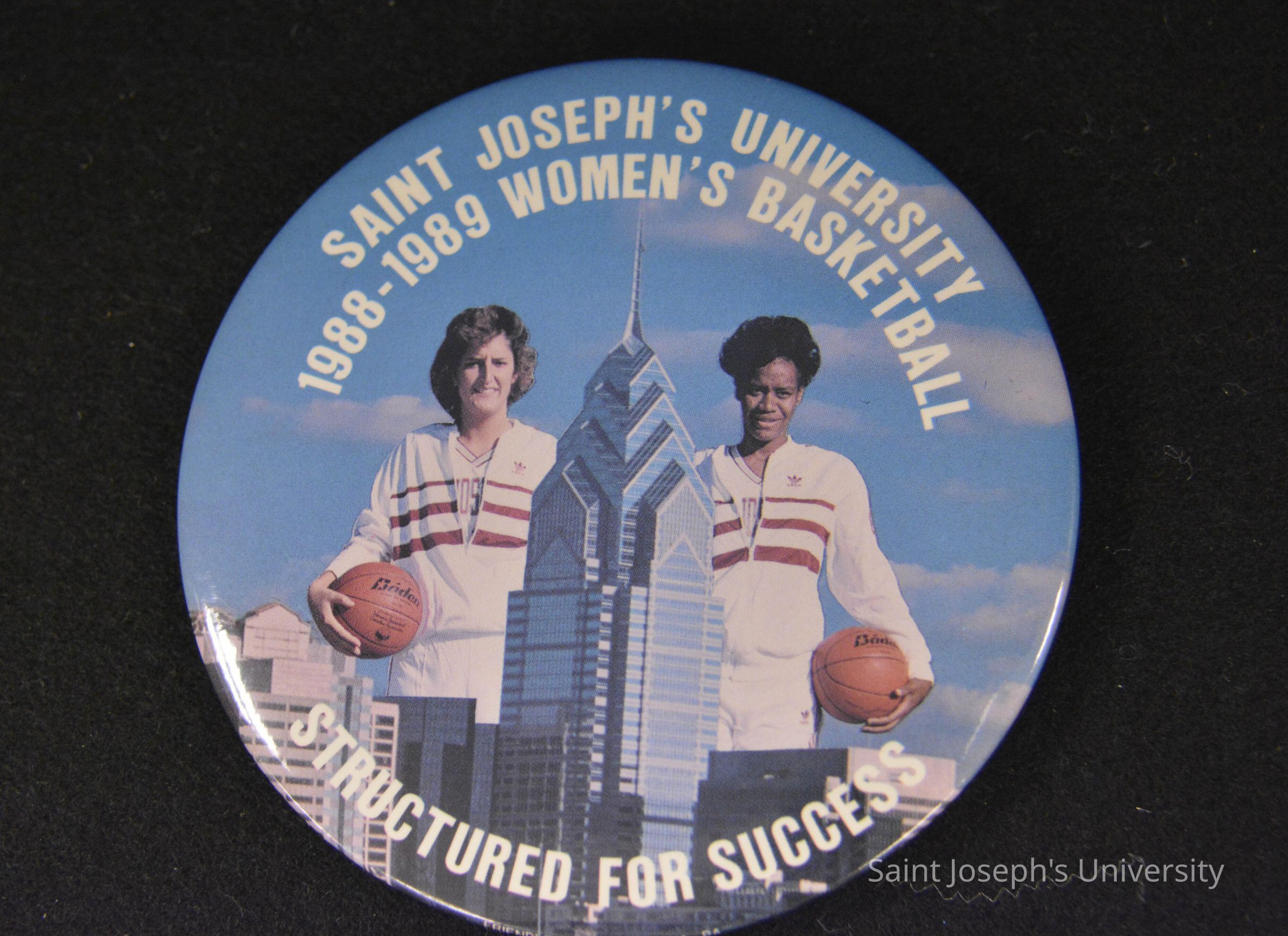 A large round button depicting 2 SJU women's basketball athletes along Philadelphia skyline and notes "SAINT JOSEPH'S UNIVERSITY'S 1988-1989 WOMEN'S BASKETBALL STRUCTURED FOR SUCCESS."Made/Created
