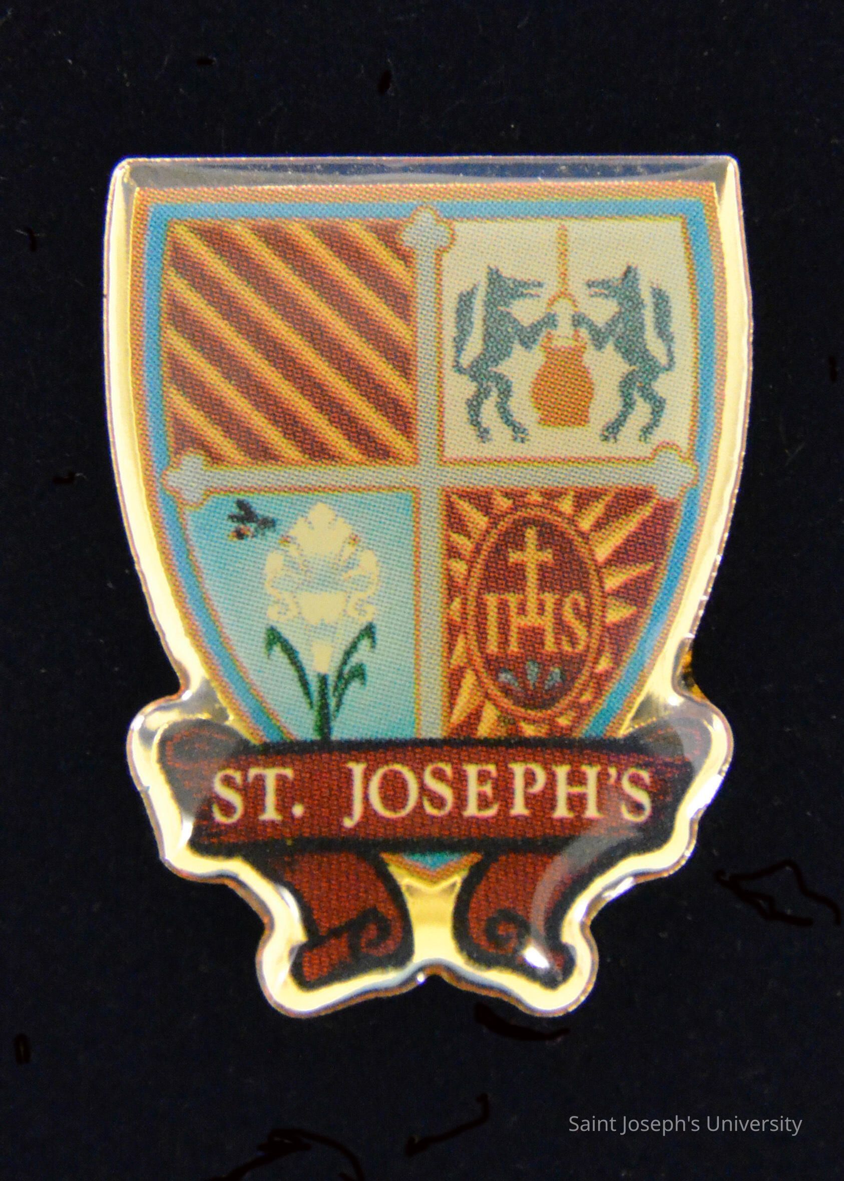 Two shield shaped pins depicting the SJU shield most likely given out in commemoration of the Sesquicentennial year.