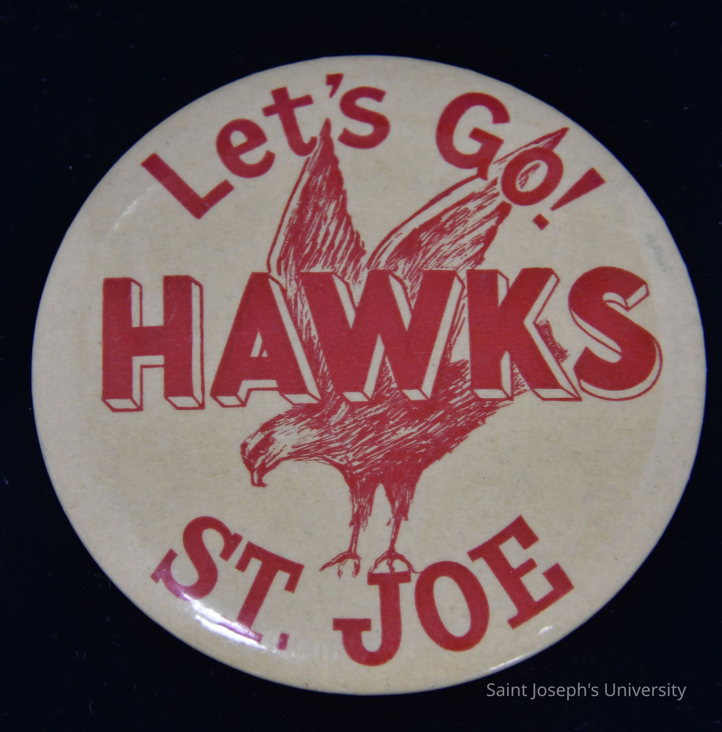 Round metal button with tan background and red lettering. The button consists of a hawk and "LET'S GO ST. JOE HAWKS."