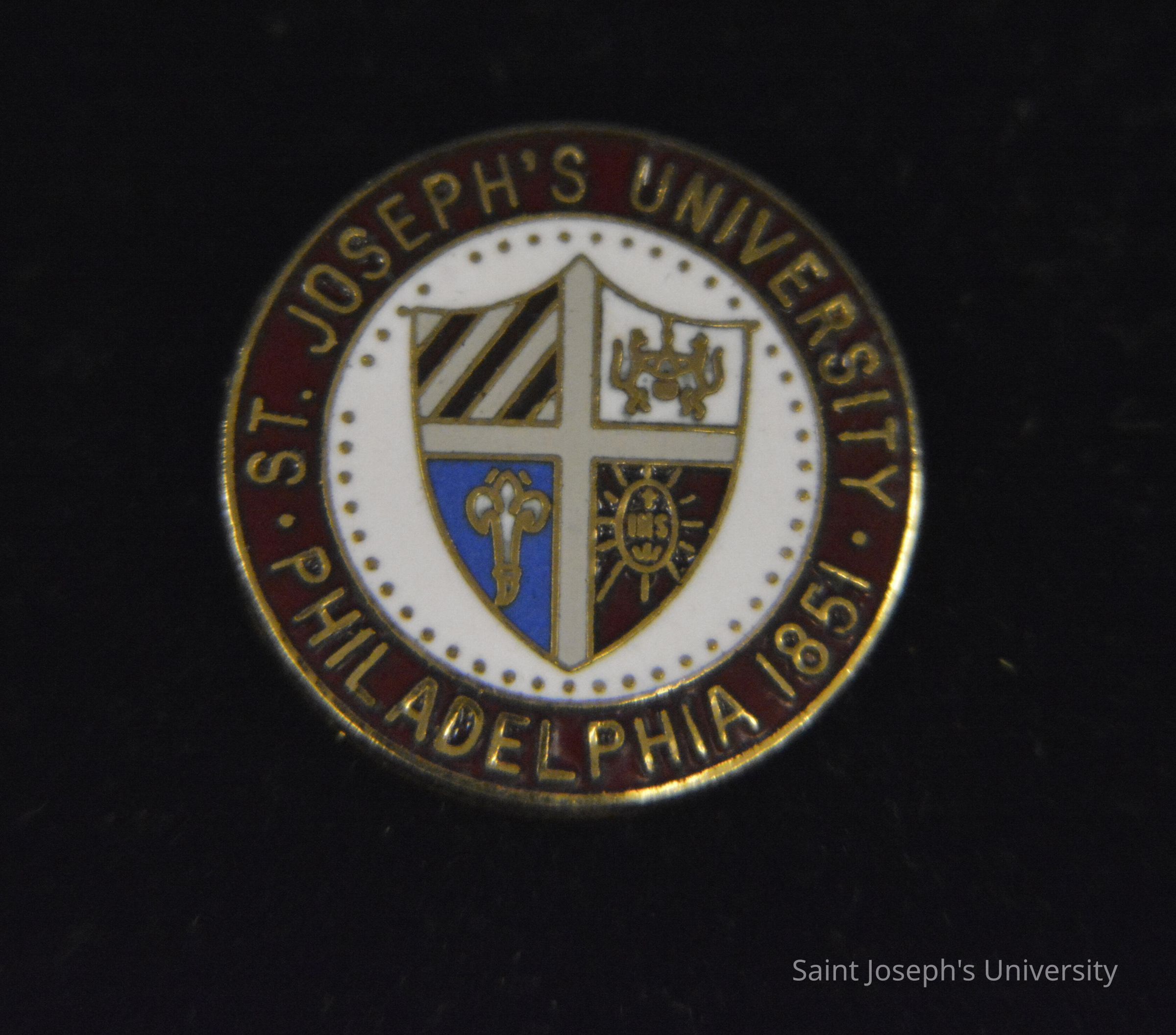 Small round metal pin depicting the SJU seal. The pin has lost its back and the prong is bent.