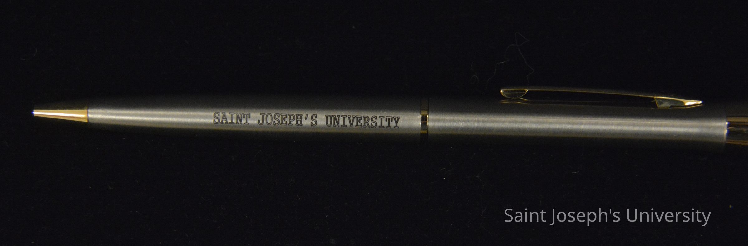 Brushed silver or pewter style ballpoint pen with gold detailing and "SAINT JOSEPH'S UNIVERSITY" along length of pen. Includes ink cartridge.