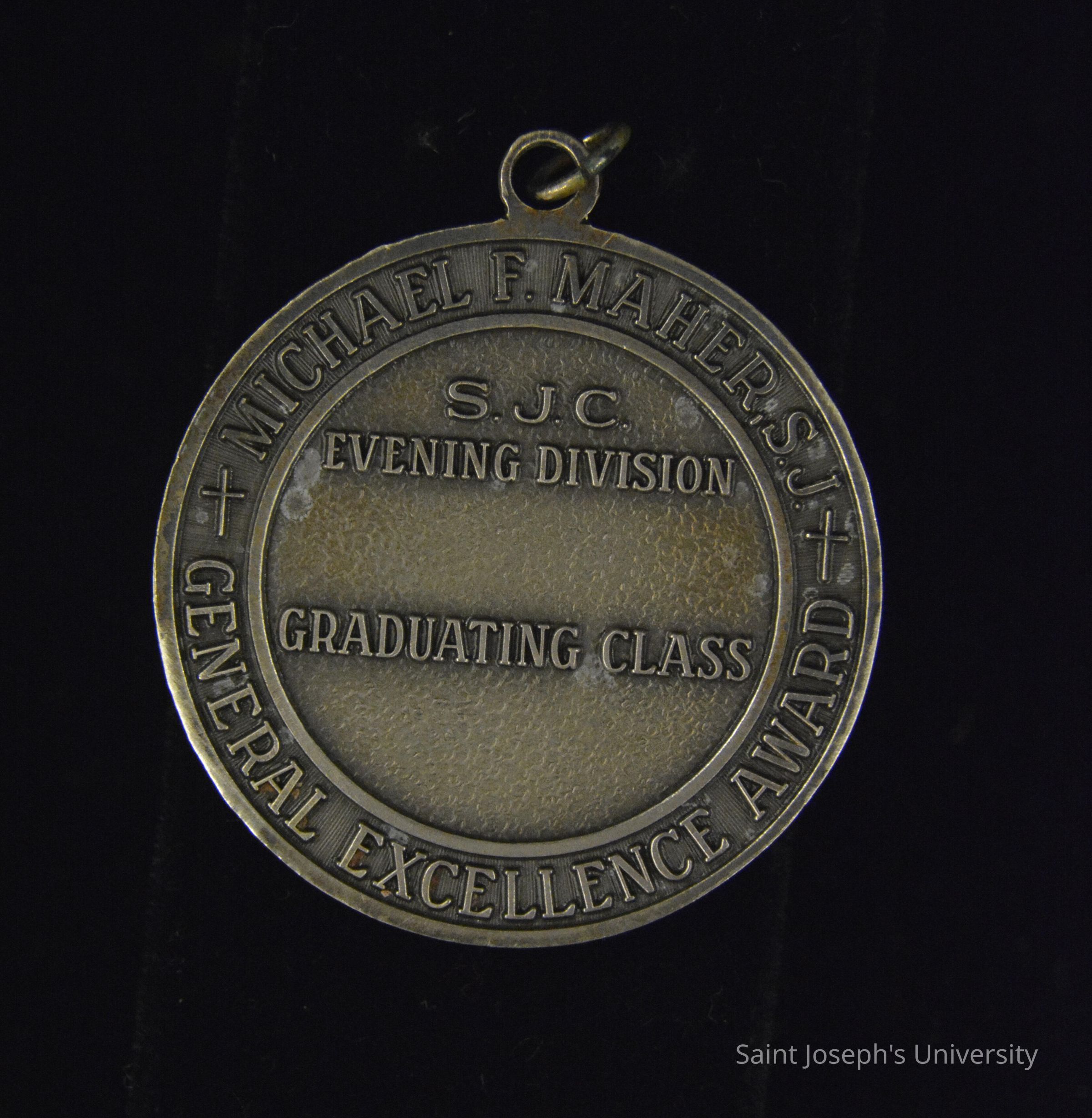 Round silver medal in original leather box. The coin front consists of an image of Barbelin Hall and "SAINT JOSEPH"S COLLEGE PHILADELPHIA PA is engraved around the center image. The back consists of a circle with "S.J.C. EVENING DIVISION GRADUATING CLASS" in the center with "MICHAEL F. MAHER, S.J. GENERAL EXCELLENCE AWARD" surrounding it.