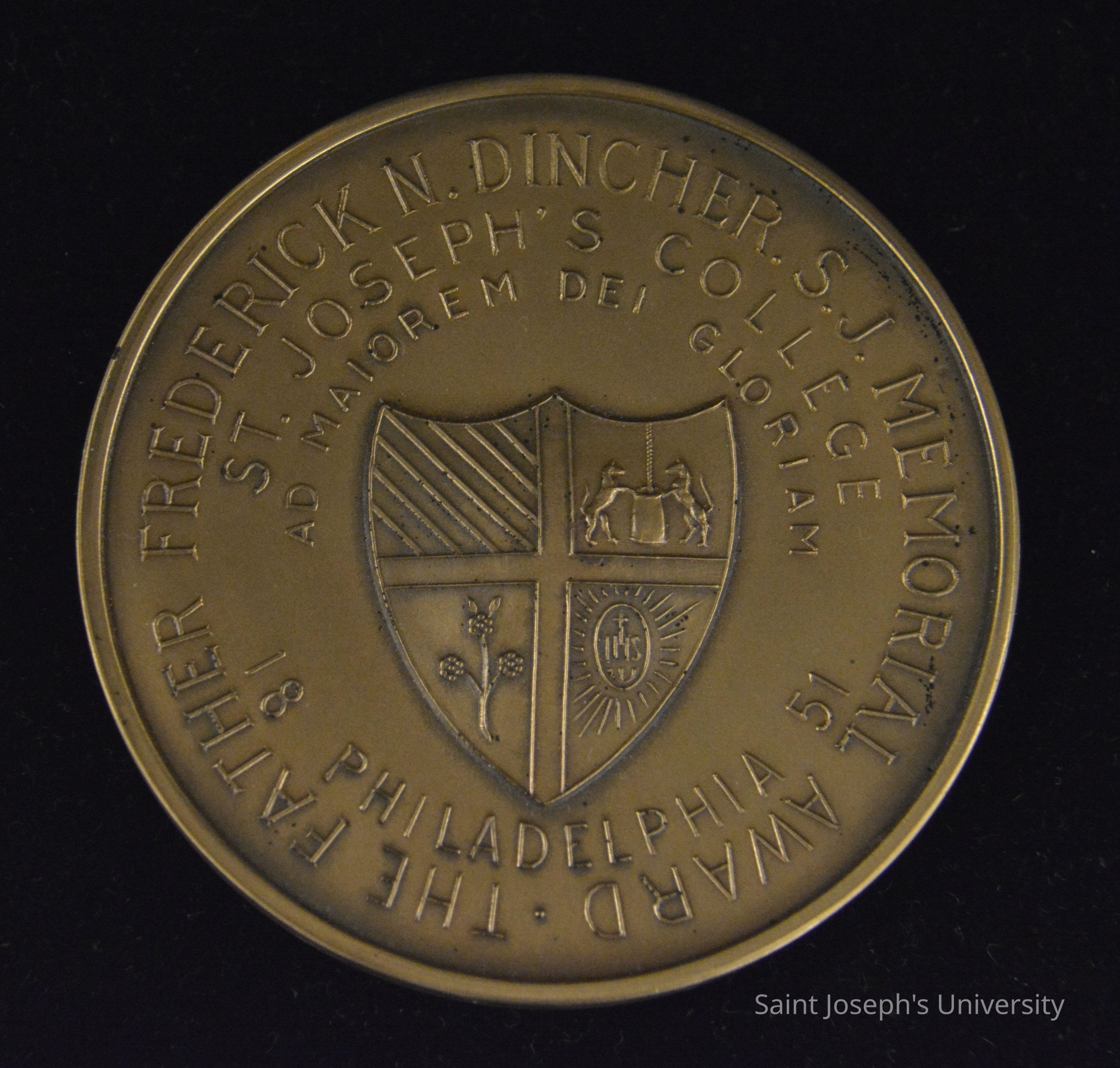 Two bronze medals depicting "THE FATHER FREDERICK N. DINCHER , S.J. MEMORIAL AWARD ST. JOSEPH'S COLLEGE PHILADELPHIA 1851 AD MAJOREM DEI GLORIAM" on the front with the SJC shield in the center.