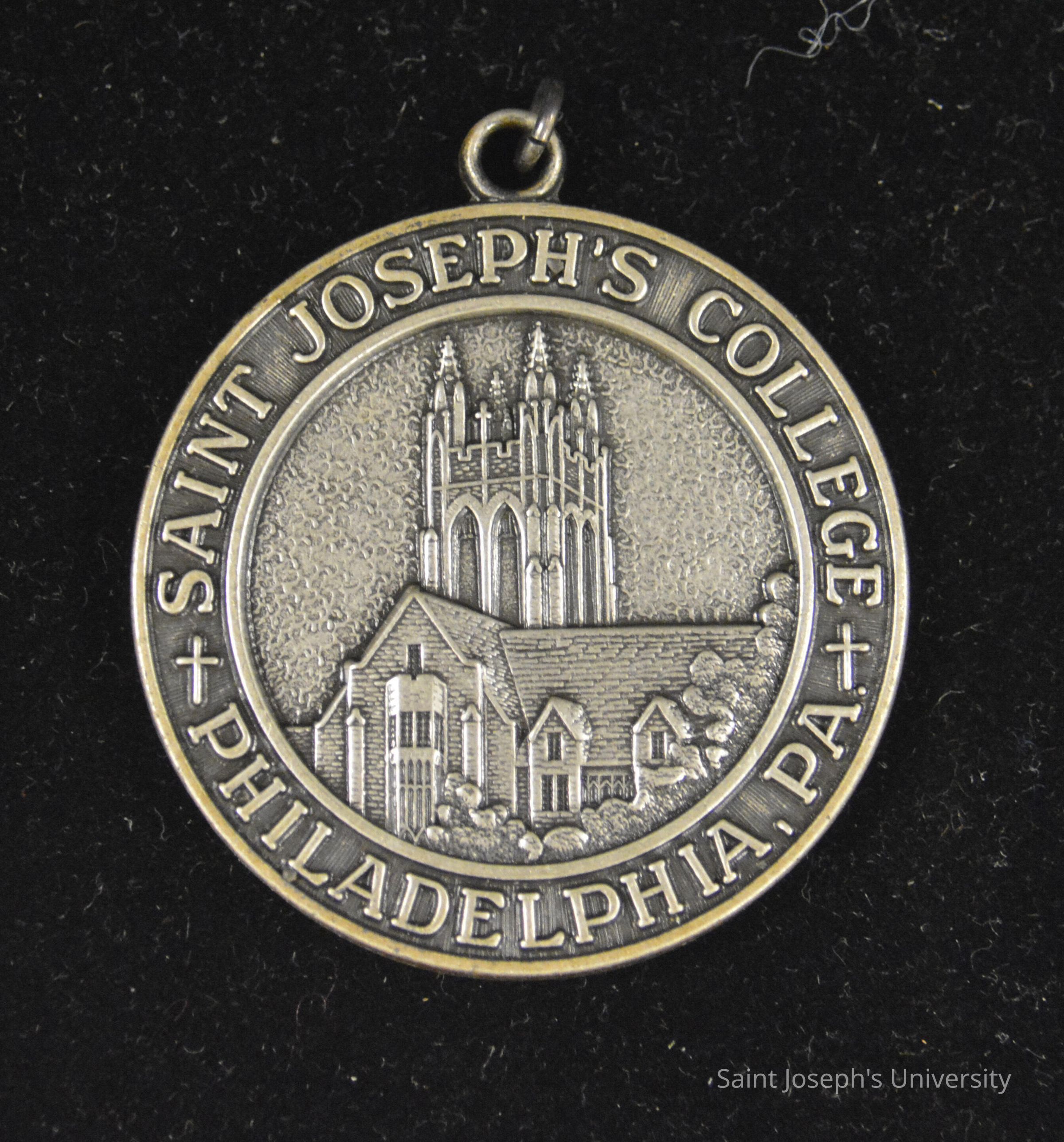 Round silver medal depicting Barbelin in the center circle surrounded by "SAINT JOSEPH'S COLLEGE PHILADELPHIA PA" on the front. The back includes "S.J.C. EVENING COLLEGE" in the center surrounded by "JOHN J. CONIFF, S.R. LEADERSHIP LOYALTY SERVICE."