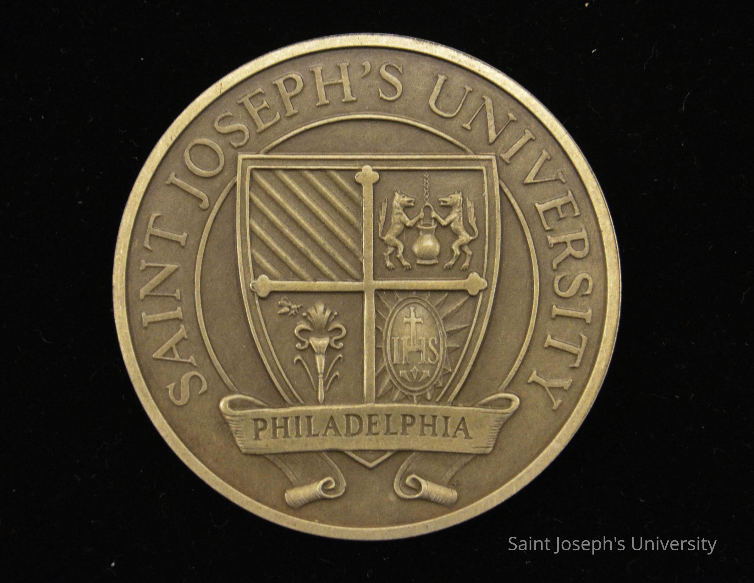 Three brushed silver or pewter round medals commemorating SJU's Sesquicentennial. The front includes the SJU shield with "SAINT JOSEPH"S UNIVERSITY" surrounding it and "PHILADELPHIA" on a banner at the base. The back includes an image of Barbelin in a shield with "FOUNDED BY THE JESUITS IN 1851" surrounding it and "SESQUICENTENNIAL" on a banner at the base.