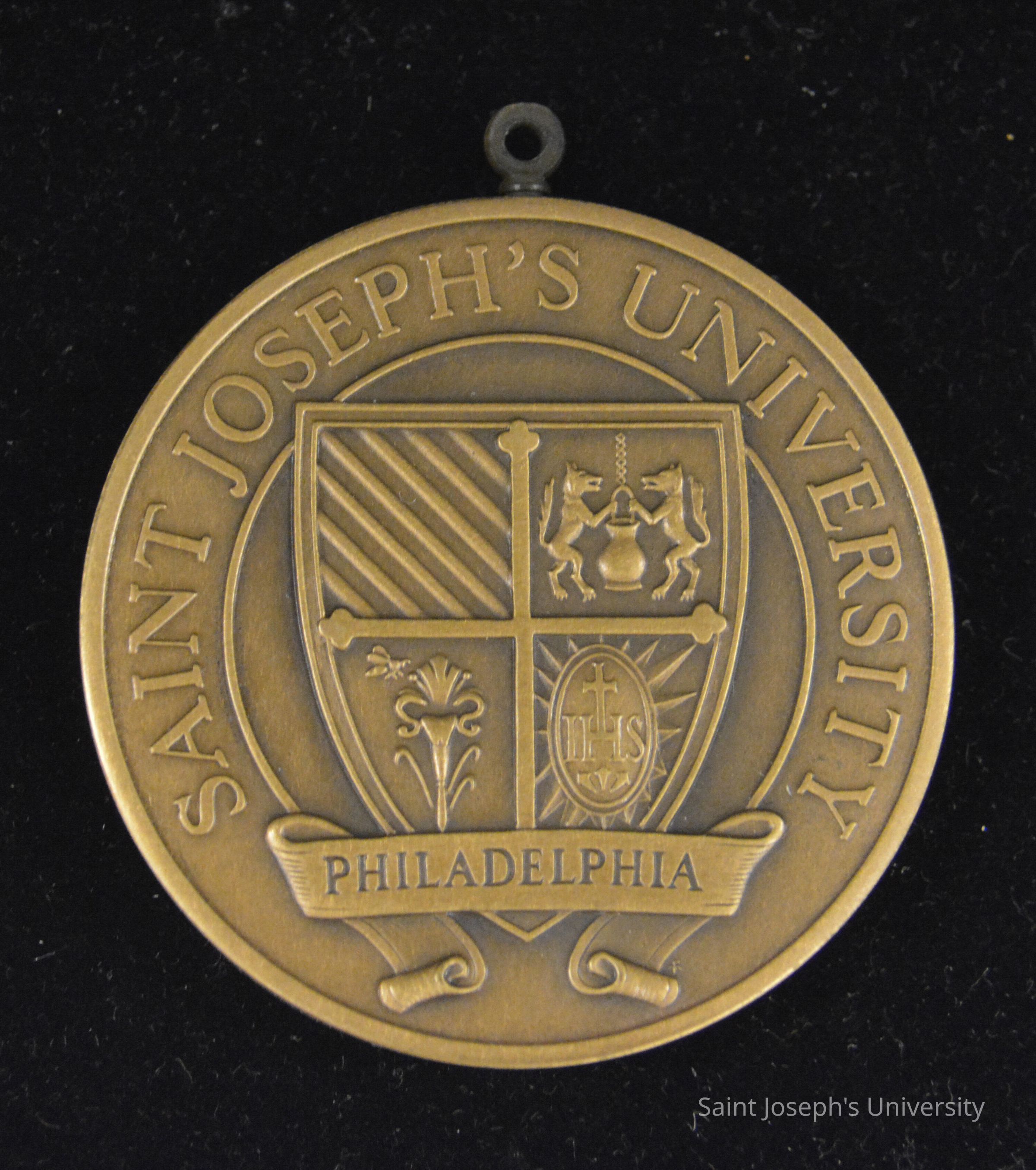 Three round bronze medals commemorating SJU's Sesquicentennial. The front includes the SJU shield with "SAINT JOSEPH"S UNIVERSITY" surrounding it and "PHILADELPHIA" on a banner at the base. The back includes an image of a lily leaf wreath tied by a ribbon.