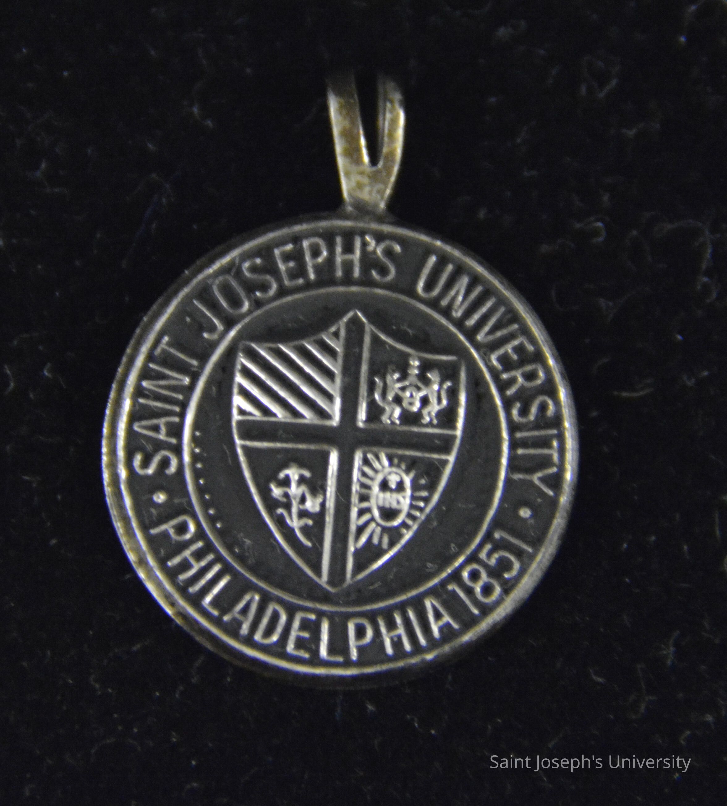 Two round silver pendants with the SJU seal on front. The back is blank.
