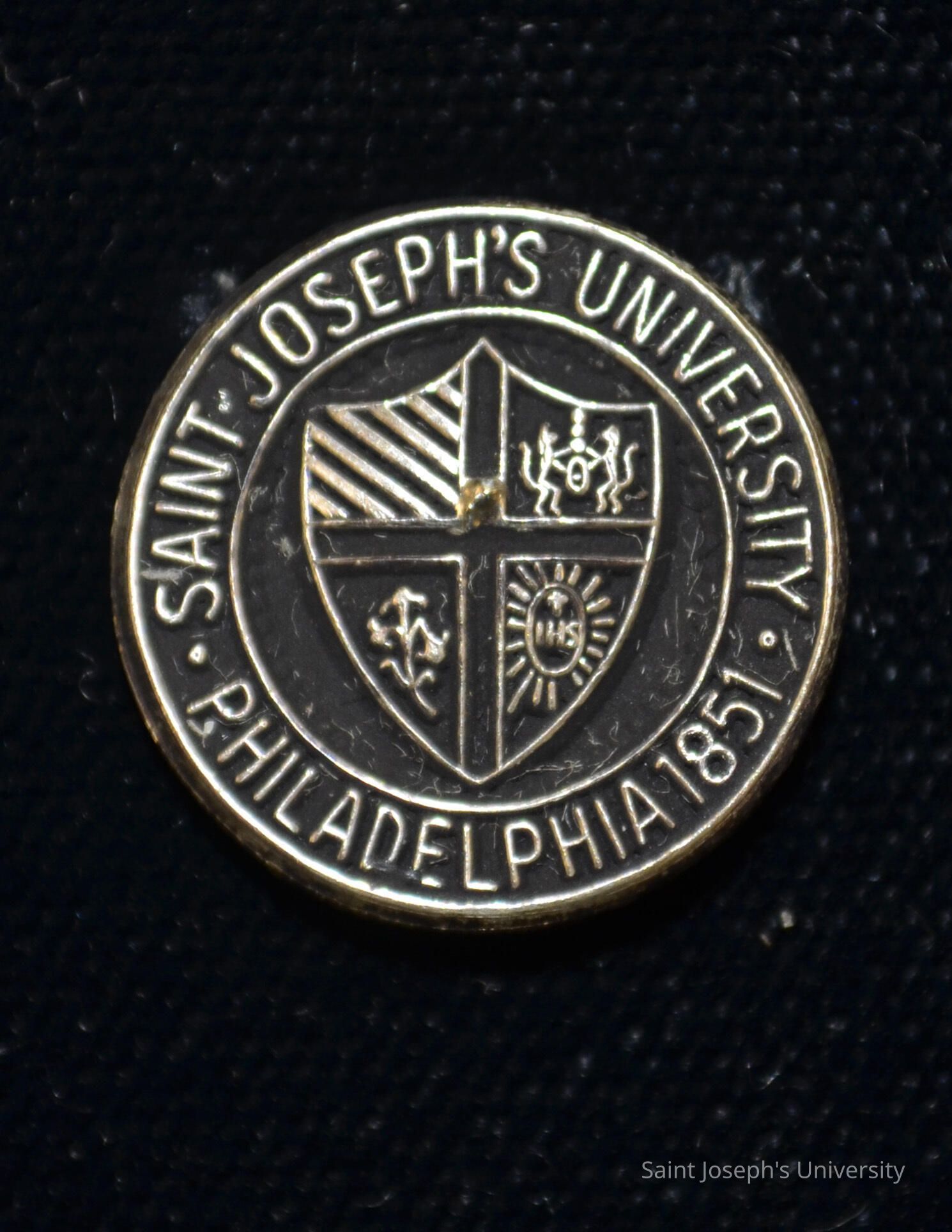 Round silver tie tack with the SJU seal on front. The back is blank.